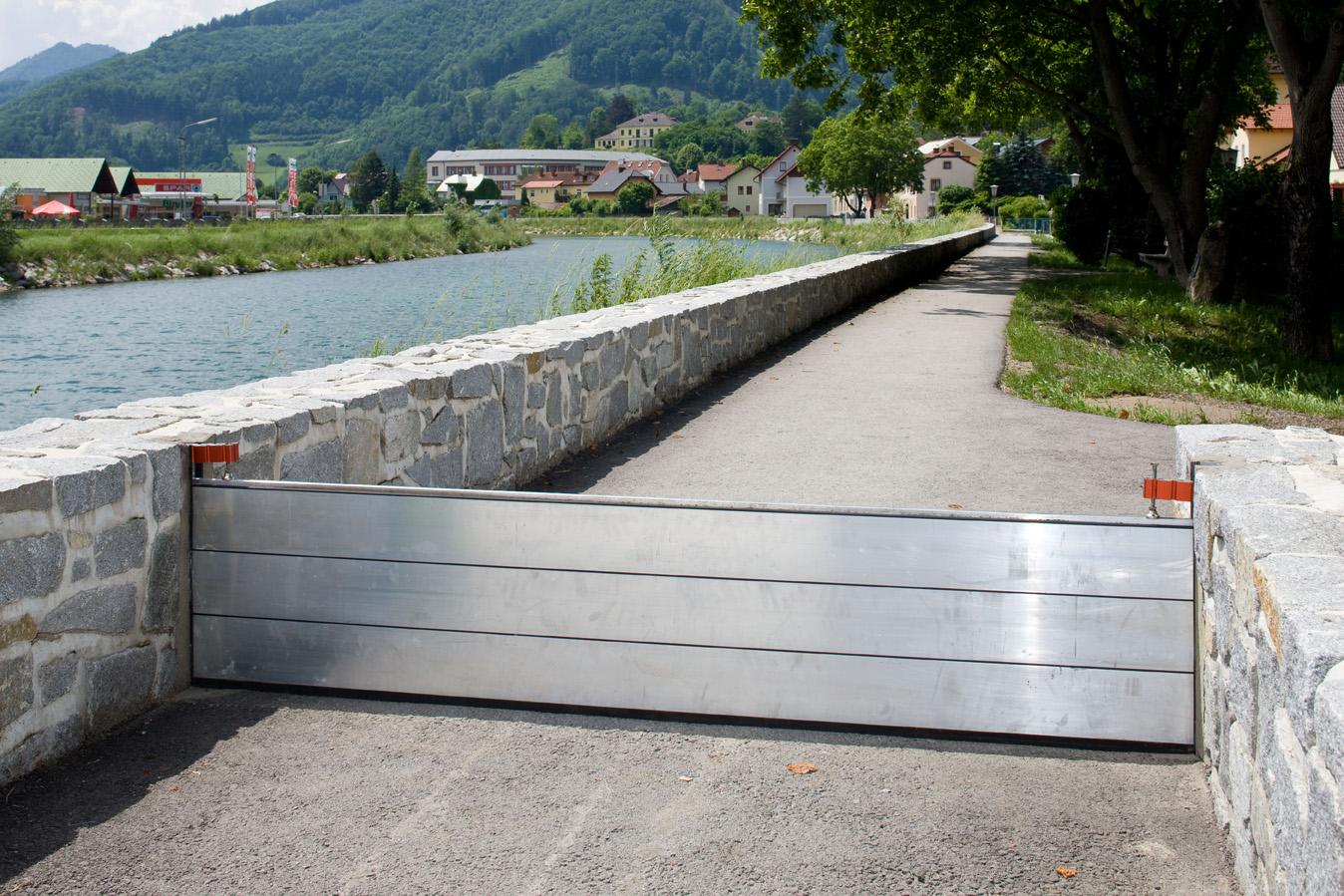 Der Schutz von überflutungsgefährdeten Objekten oder Flächen (Zufahrten, Straßen oder Wege) erfolgt durch Schutzwände, die mit Hilfe von Bodenhülsen im offenen Gelände aufgestellt werden.