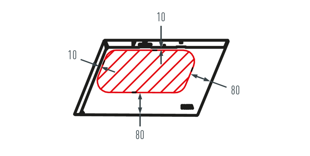 Achten Sie bei der Montage von Dachzubehörprodukten auf den zulässigen Montagebereich auf den Dachschindeln. Nachfolgende Abbildung zeigt den Montagebereich für Zubehörprodukte auf Fußteilen. Für andere Zubehörprodukte können abweichende Montagebereiche definiert sein.