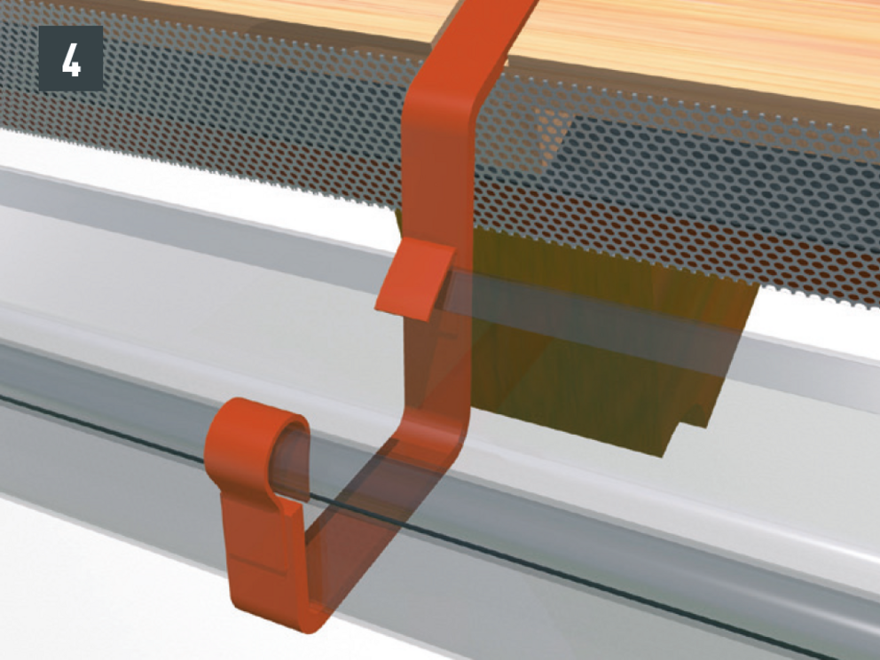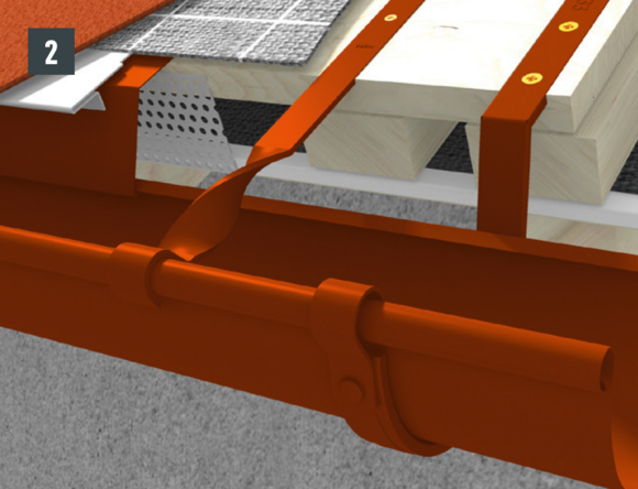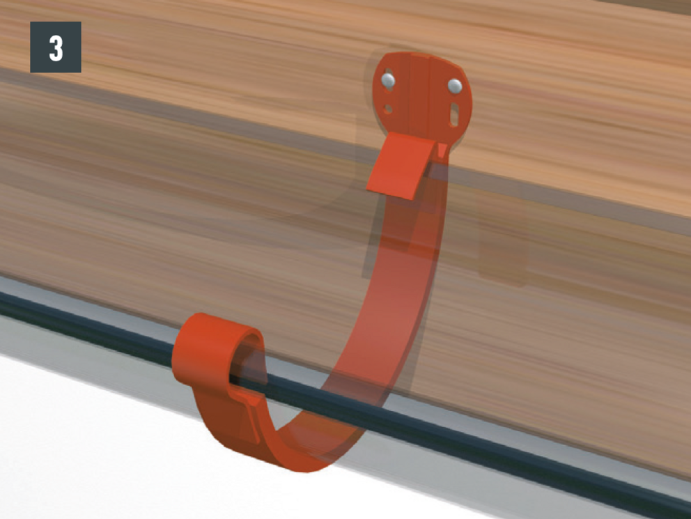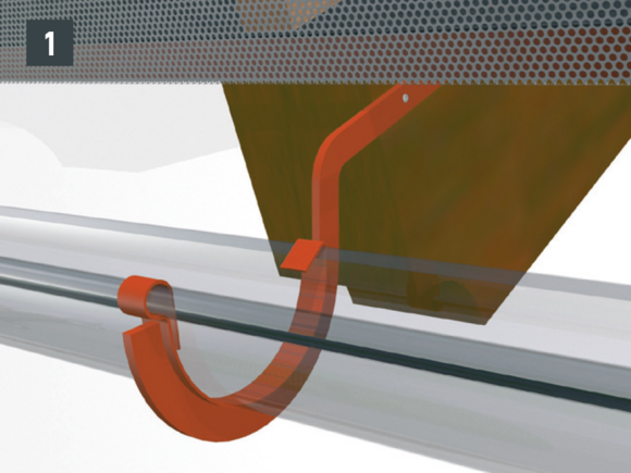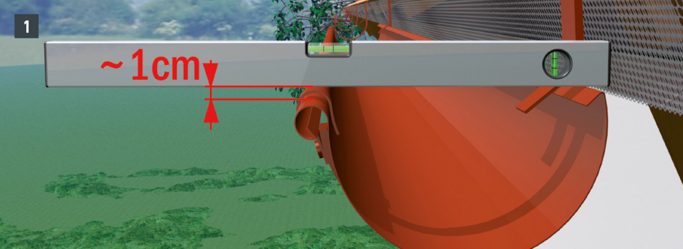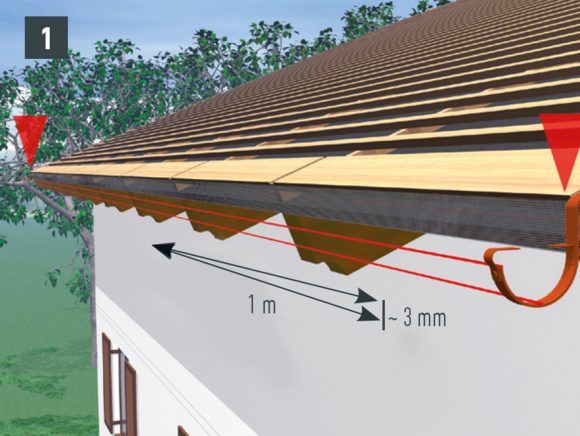 • Dachrinne im Gefälle montieren (ca. 3 mm pro Meter), Rinnenhaken üblicherweise im Sparrenabstand befestigen (Bild 1).