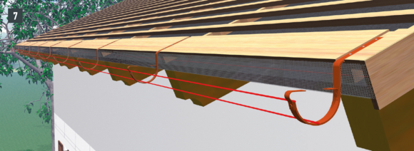 • Rinnenhaken nach Schnur im Gefälle mit mind. 2 Stk. Rinnenhakennägel 5×80 mm oder Schrauben 5×80 mm montieren (Bild 7).