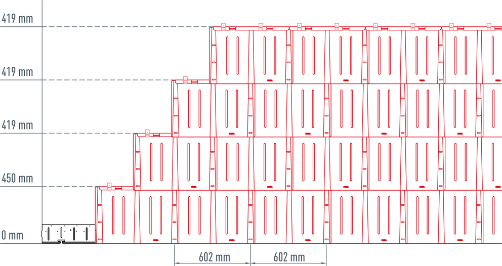Die Anfangsschnürung erfolgt in der Mitte der Fassadenfläche, einem seitlichen Abschluss oder Gebäudeeck. Der Saumstreifenansatz ergibt sich aus der eingezeichneten Plattenaufteilung. Der senkrechte Winkelschlag wird entweder auf Rillenmitte gesetzt oder mittig zwischen zwei Rillen, der horizontale Schnurschlag 419 mm immer zur Plattenoberkante. Der senkrecht durchzuführende Schnurabschlag muss durch 301 mm teilbar sein.