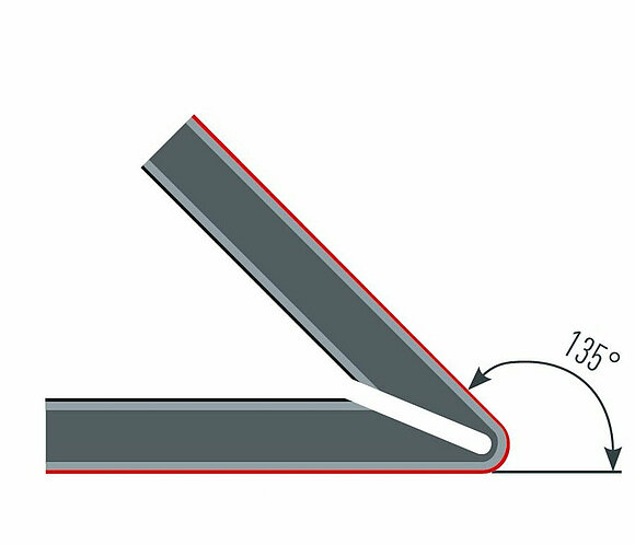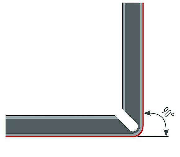 Beachten Sie, dass die Verbundplatten nach dem Abkanten wieder etwas zurückfedern. In der Praxis bedeutet dies, dass die Abkantung etwas stärker als gewünscht gebogen werden muss, um nach dem Nachfedern die perfekte Maßhaltigkeit aufzuweisen. Die kleinstmögliche Schenkellänge einer Abkantung beträgt 20 mm.