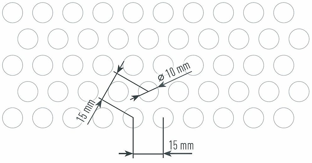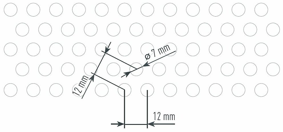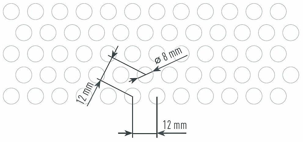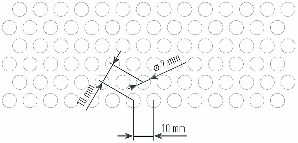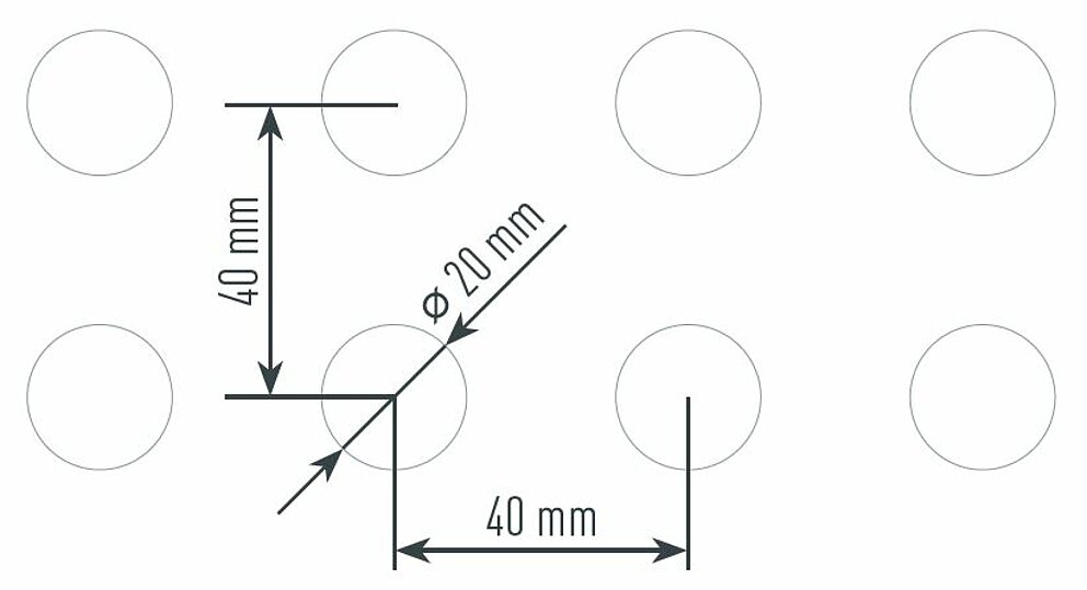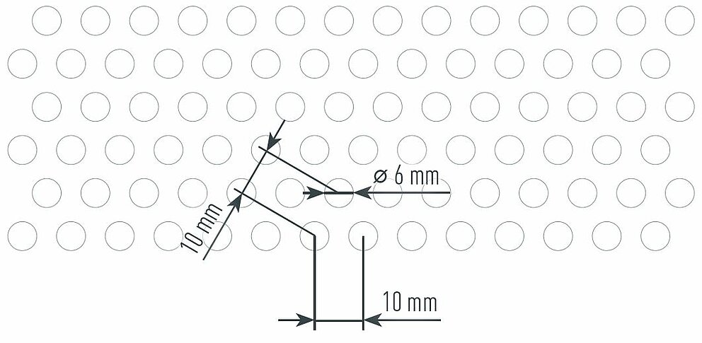 Perforierte PREFABOND Verbundplatten verfügen über ein gleichmäßiges Lochmuster. Aufgrund der Mineralstruktur des Kerns wird eine Perforierung mit Stanzmaschinen für die PREFABOND mit A2-Kern nicht empfohlen.
