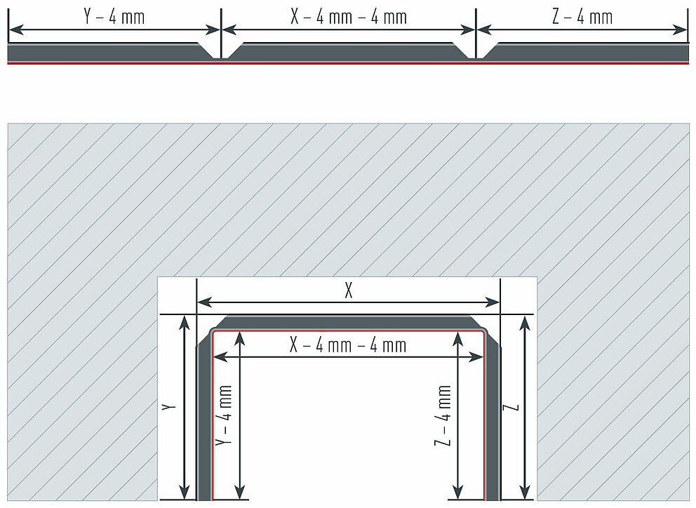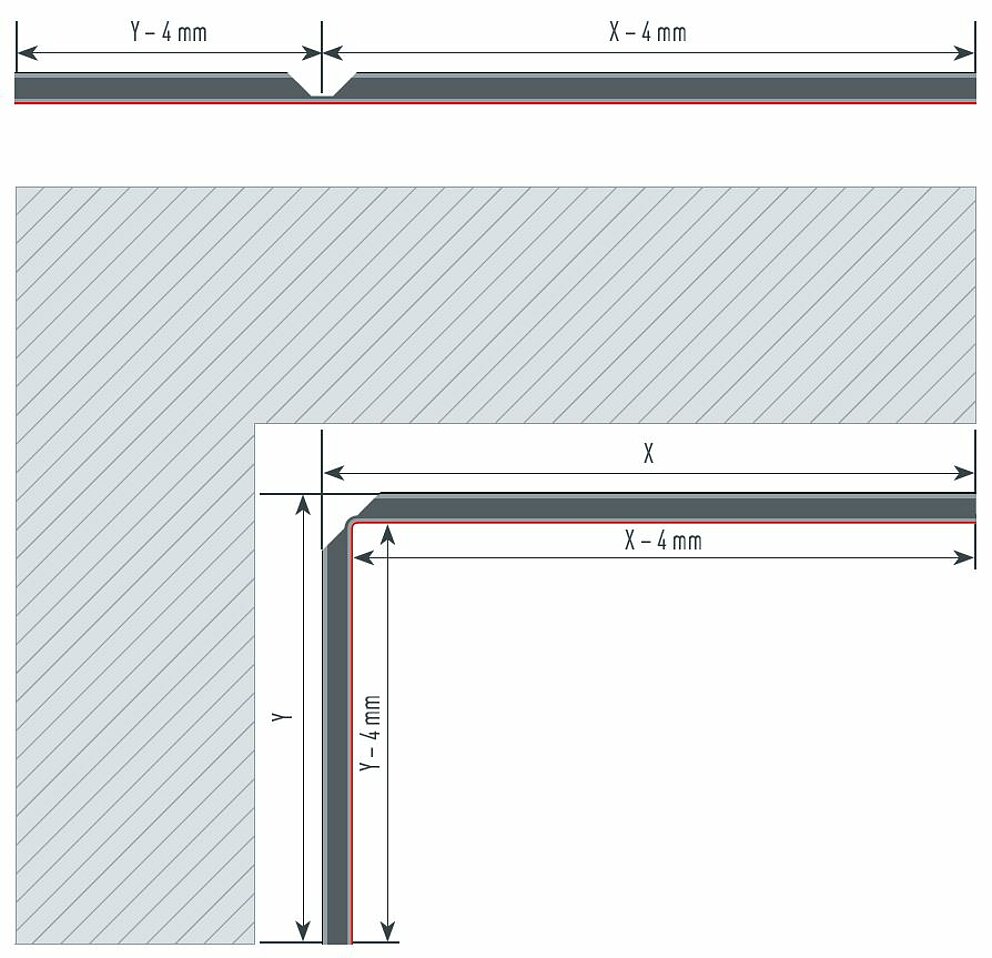 Bei einer Innenecke ist die Materialstärke der Verbundplatte (4 mm) von den gemessenen Naturmaßen abzuziehen.
