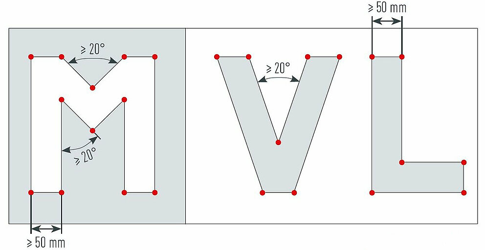 Beachten Sie die Mindestabmessungen und -winkel, die materialtechnisch möglich sind. Spitze Winkel können ab einer Winkelöffnung von 20° gefertigt werden. Liegt die Winkelöffnung unter 20°, muss die Spitze des Winkels mit einem Steg von mindestens 25 mm beendet werden.