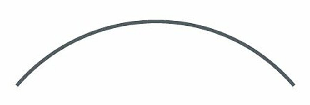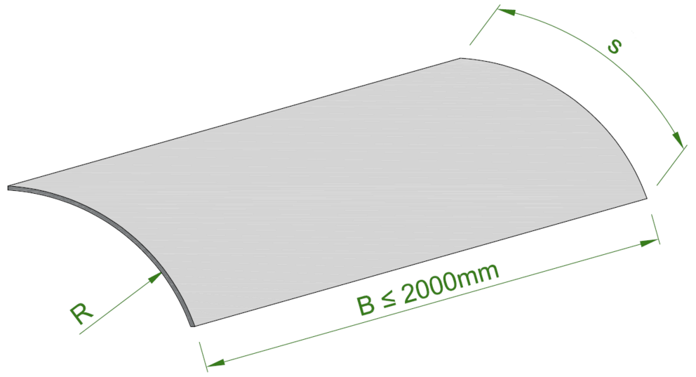 Bedingt durch das Biegen mit Walzen haben die Platten einen Auslauf mit einer kleinen Druckstelle, die durch PREFA zurückgeschnitten wird. Beachten Sie die Abmessungen des Rohmaterials! Der Zuschnitt ist nämlich an den Plattenenden um 200 mm größer als das effektiv benötigte Bogenmaß. Zum Bogenmaß (s) werden an einem Ende 150 mm und am anderen 50 mm addiert.