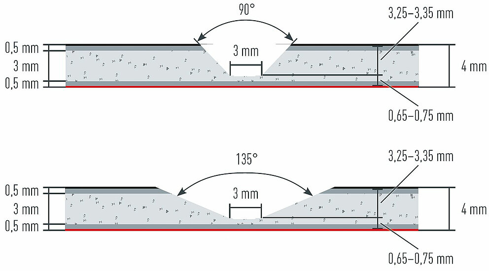 Die für eine Abkantung erforderliche V-Nut wird, unabhängig ob Innen- oder Außenecke, immer auf der Plattenrückseite gefräst. Eine korrekte V-Nut-Fräsung ist so auszuführen, dass einerseits 0,5 mm des Deckbleches (lackierte Sichtseite) und andererseits beim Kern weitere 0,2 bis 0,4 mm (FR-Kern) resp. weitere 0,15 bis 0,25 mm (A2-Kern) erhalten bleiben.