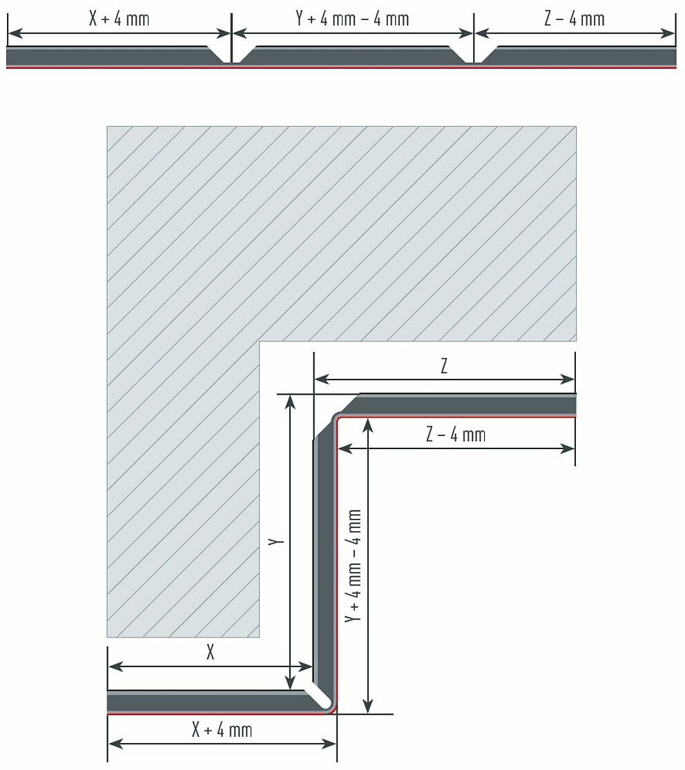 Bei einer Außenecke ist die Materialstärke der Verbundplatte (4 mm) den gemessenen Naturmaßen hinzuzufügen.