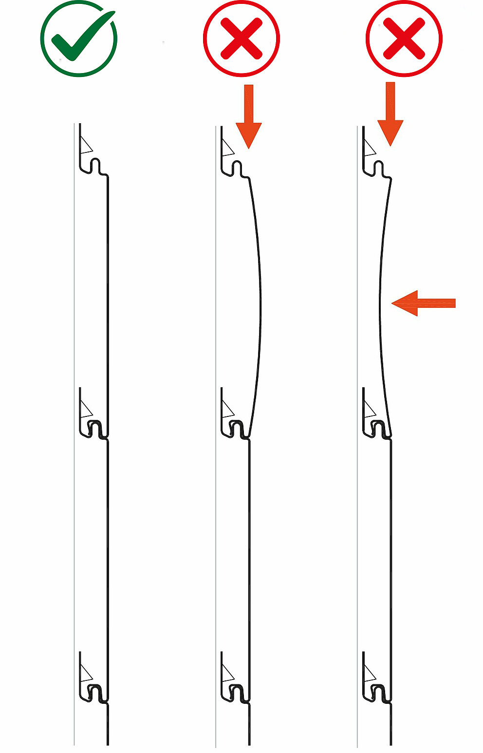 Beachten Sie, dass die Montage im druckfreien Zustand erfolgen muss. Stecken Sie Siding, Siding.X und Siding Perforiert nicht zu fest unter Druck ineinander, da dies zu Verspannungen führen kann. Das Siding muss absolut plan an der Unterkonstruktion anliegen, um eine konkave oder konvexe Verformung des Sidings zu vermeiden.