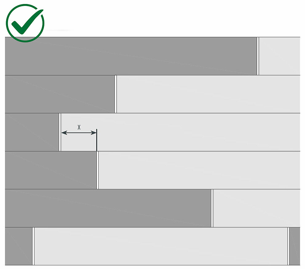 PREFA empfiehlt, dass der Versatz (x) mind. einen Abstand entsprechend der verlegten Baubreite (BB) beträgt (z. B. bei Siding 138×0,7 mm = mind. Versatz 138 mm):