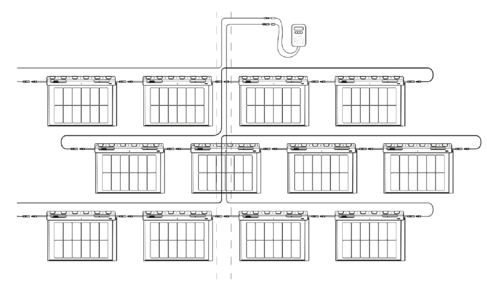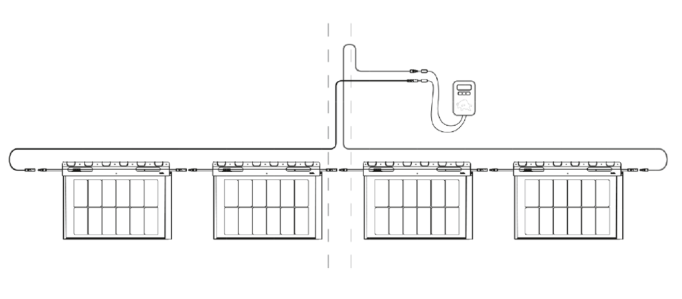 Sind alle Reihen eines Stranges fertig verlegt, erfolgt die Spannungsprüfung zwischen Zu- und Ableitung (siehe Abbildung oberhalb).
