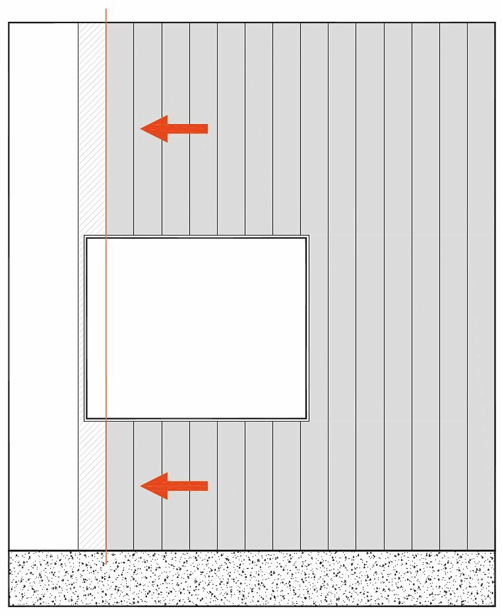 Sia nel caso della posa verticale che di quella orizzontale, è opportuno marcare con il battitraccia la larghezza utile delle Doghe intorno alla finestra, altrimenti si rischia di perdere l'allineamento.