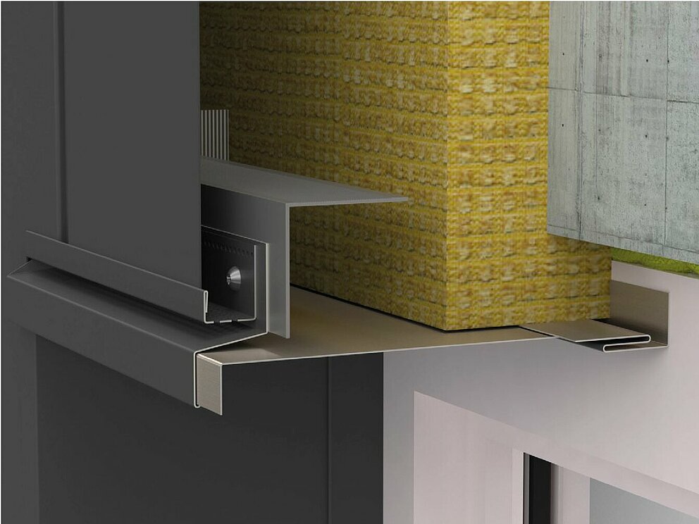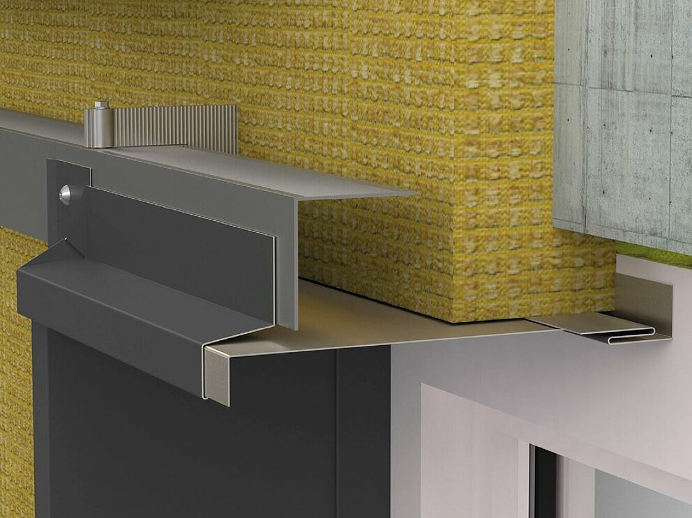 Bordare poi una lamiera di rivestimento superiore in base alle esigenze costruttive del cantiere e spingerla nel profilo a inserto. Il gocciolatoio viene attaccato nella lamiera di rivestimento superiore.