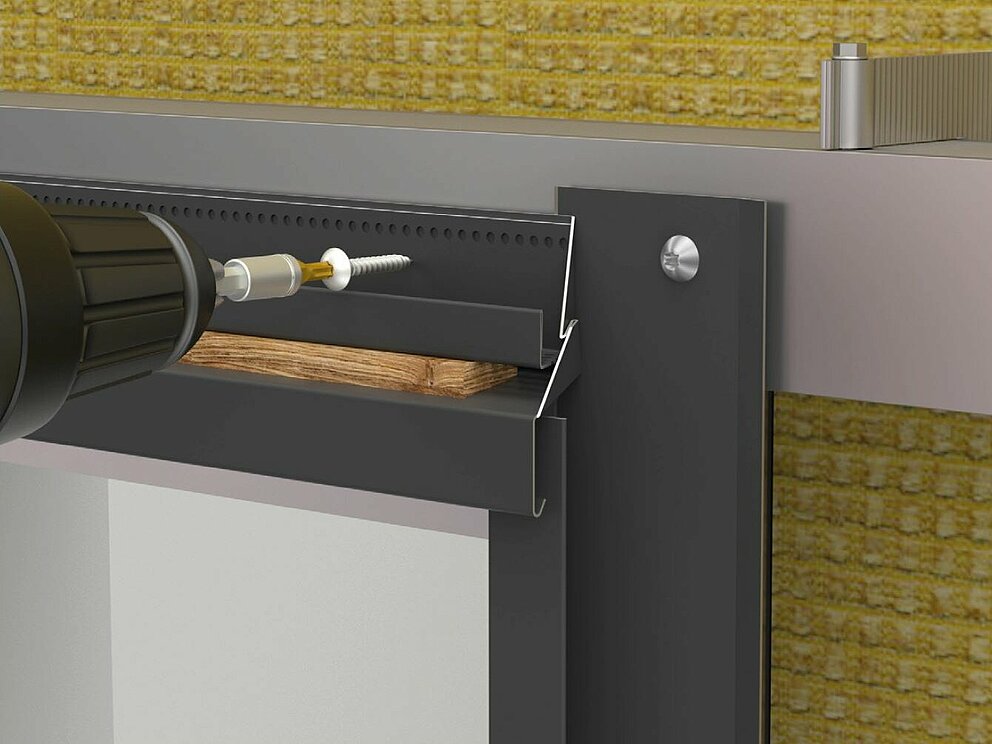 Quindi avvitare l'angolare di bloccaggio per la lamiera di rivestimento alla sottostruttura a sinistra e a destra della finestra. Contemporaneamente fissare anche i profili a inserto per la lamiera di rivestimento e quello per l'architrave all'intelaiatura della finestra o al muro.