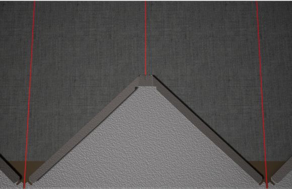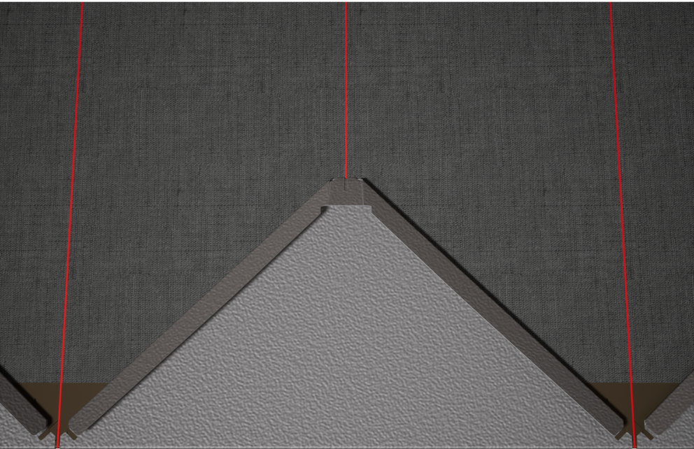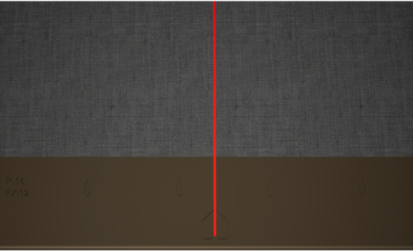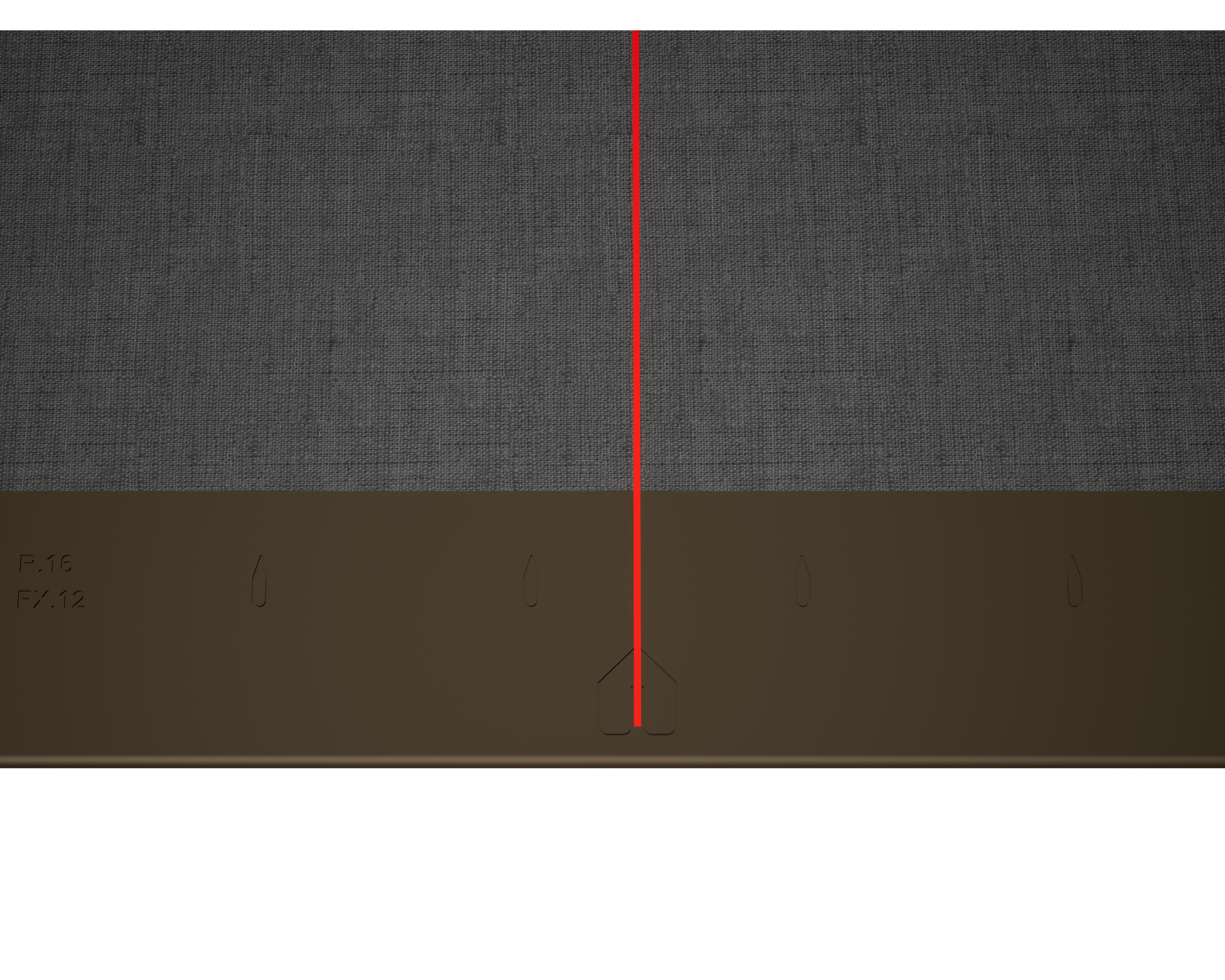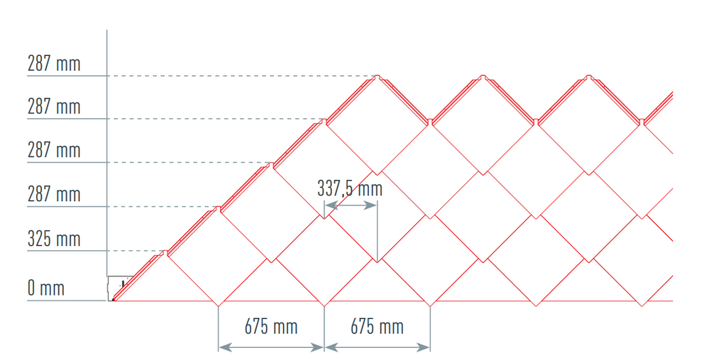 Per aiutare a posare le griglie PREFA 44×44, si consiglia di realizzare una griglia di trappole verticali a una distanza di 675 mm (ad esempio, i contrassegni sulla striscia dell'orlo). Per mantenere la misura della traccia esattamente uguale in ogni fila, se necessario, si può segnare anche la metà della misura della traccia e verificarla a intervalli regolari. Allineare le piastre di partenza con le tacche (sul bordo superiore delle piastre di partenza) alle battute verticali del filo (vedi figura sotto). Va notato che l'area per la smussatura laterale (ad esempio la finitura laterale o gli angoli dell'edificio) non si trova al centro delle griglie a parete 44×44 (osservare la superficie della facciata simmetria).