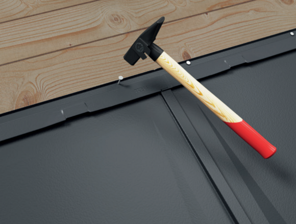 Posizionare correttamente la tegola R.16 e inserirla nell’aggraffatura. Picchiettare leggermente il bordo inferiore della tegola con il manico del martello.