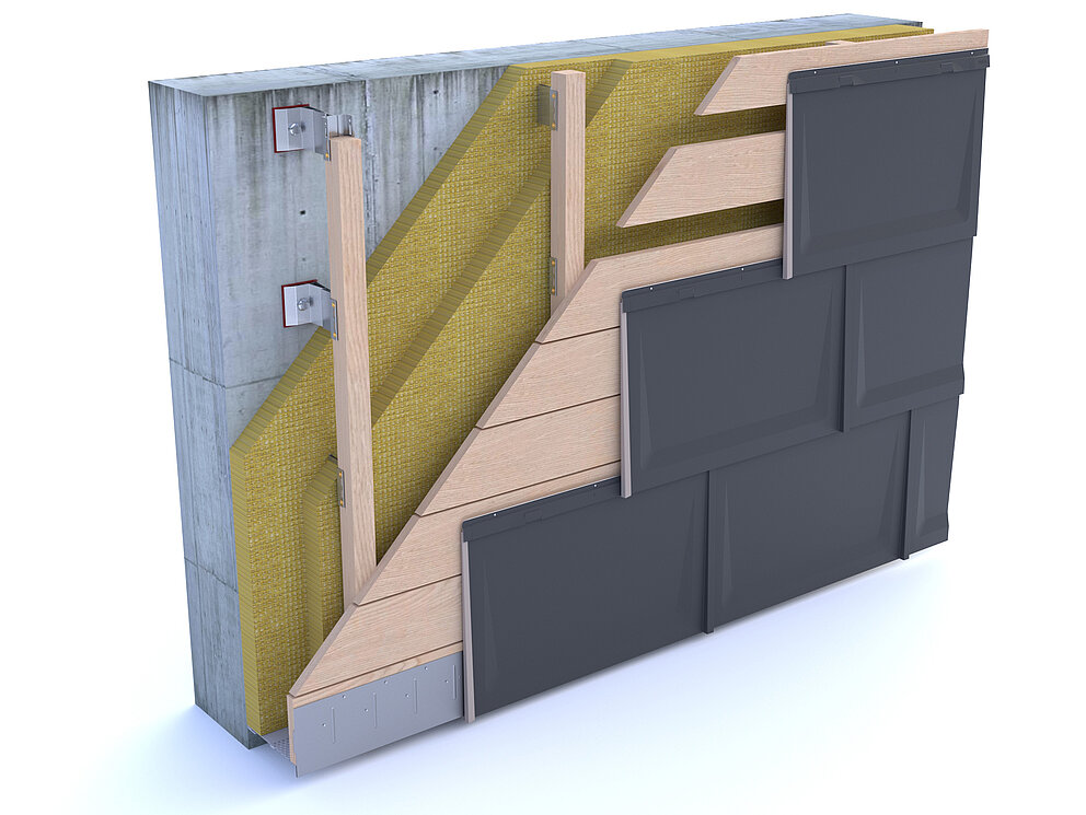 La tegola fotovoltaica per la facciata può essere posata anche su un tavolato distanziato (spessore minimo di 24 mm). Durante la posa del tavolato distanziato, assicurarsi che ci sia sempre una tavola sotto il listello di fissaggio e che venga rispettata la distanza tra i listelli di 420 mm.