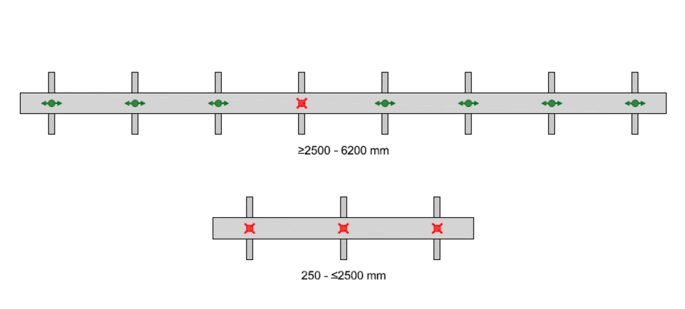 A seconda della lunghezza dei profili estrusi, il fissaggio dev'essere effettuato con punti fissi e punti scorrevoli. Indipendentemente dalla direzione di posa, piazzare un solo punto fisso al centro di ciascun profilo. Il resto del fissaggio alla sottostruttura viene realizzato con punti scorrevoli.