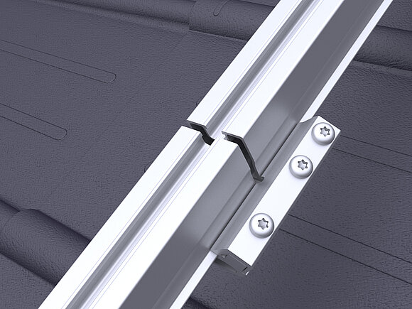 Il connettore della rotaia deve essere montato in modo tale che le viti di fissaggio si trovino sul lato anteriore della rotaia. In questo caso, si deve rispettare la distanza tra le due rotaie indicata tramite un'incisione per consentire l'espansione termica delle singole rotaie.