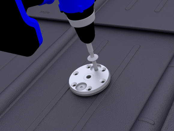 Viti fisse della parte del piede con 6 viti di fissaggio ciascuna 6,0×40/24 mm, fino a quando la guarnizione di superficie non viene pressata sulla copertura del tetto e sulla sottostruttura. Il fissaggio è corretto quando la guarnizione presenti un leggero rigonfiamento verso l’esterno (bit: Torx 40).