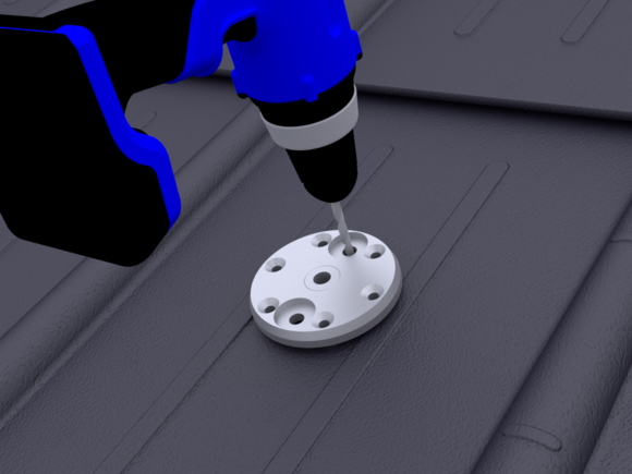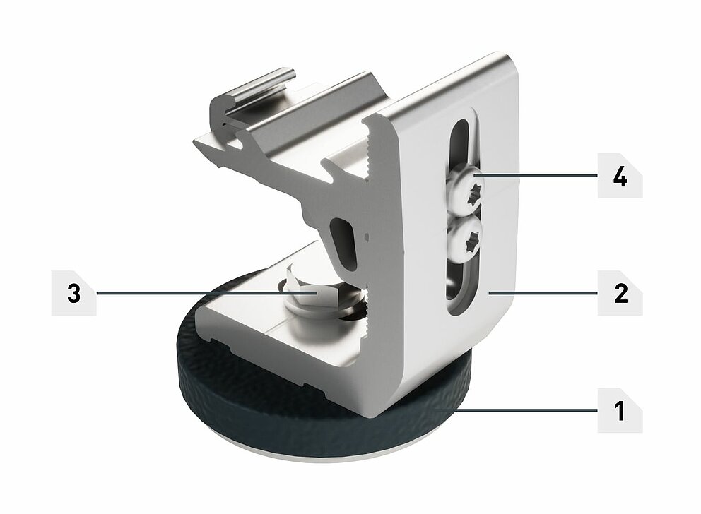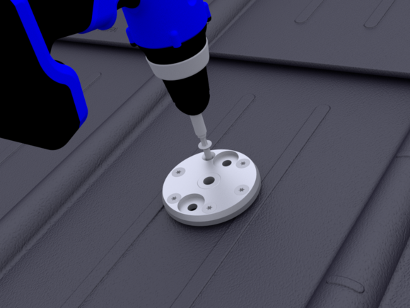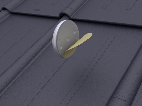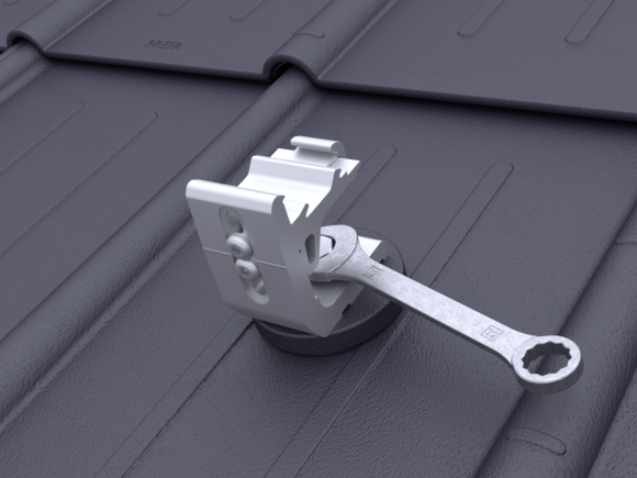 Applicare il tappo di copertura, applicare il corpo di base sulla parte del piede e quindi fissare con la vite esagonale (chiave a forcella: SW 18). PREVARIO 3.S è adatto per il montaggio su coperture di piccole dimensioni PREFA.