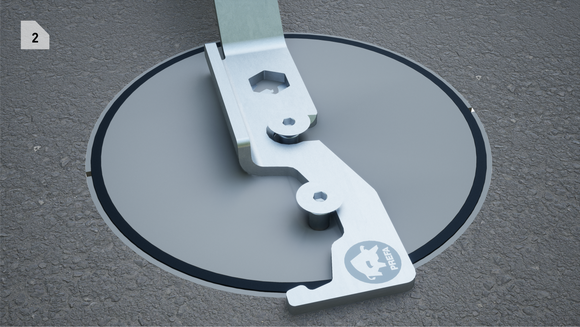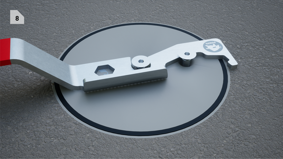 • Aprire il coperchio bloccabile (2 viti): Svitare di circa 1 cm le viti con una chiave a brugola da 6 mm, continuare a girare la vite centrale finché non si avverte più alcuna resistenza, quindi inserire il dispositivo di sollevamento, ruotarlo di 90° ed estrarlo
