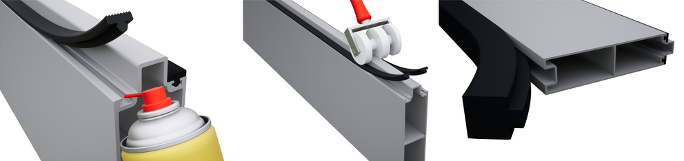 • Premere la guarnizione della sponda in entrambe le scanalature sulla parte superiore della sponda È possibile utilizzare il rullo per guarnizioni e lo spray al silicone come ausilio al montaggio per facilitare la pressione. Montare la guarnizione a pavimento sul lato inferiore della sponda.