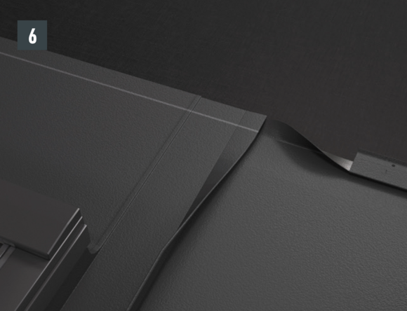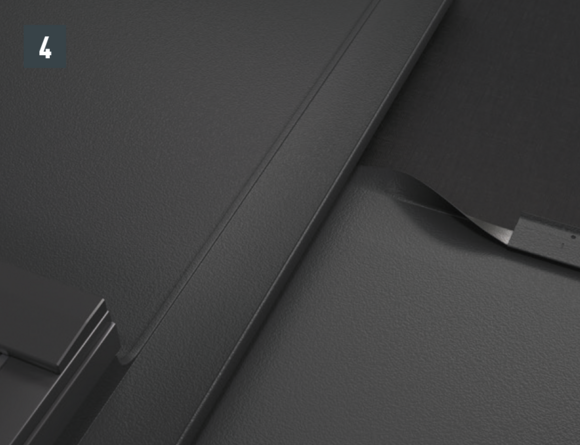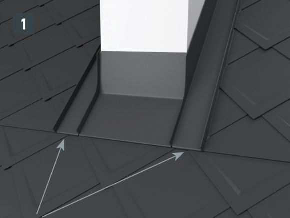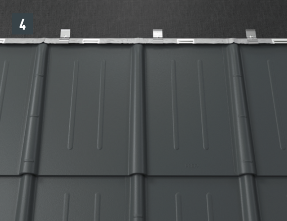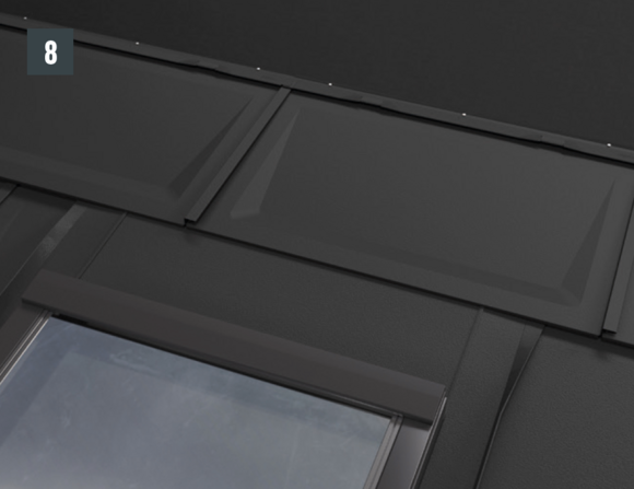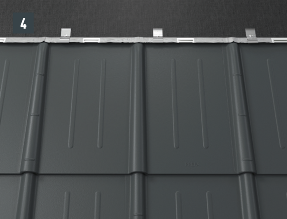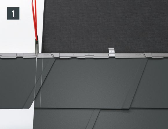Dopo aver montato le tegole, fino alla posizione desiderata della scossalina per lucernario, allineare la bordatura superiore della tegola in modo che sia possibile agganciare la parte anteriore della scossalina per lucernario PREFA.