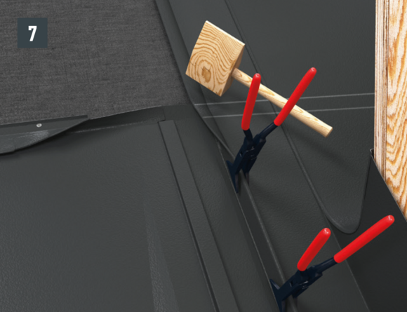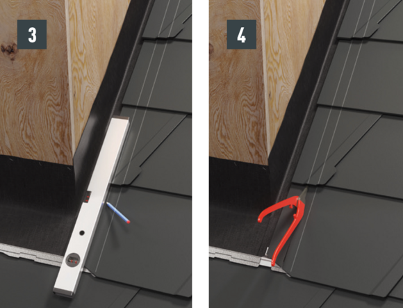 La ripiegatura della copertura rispetto alle aggraffature laterali è determinata dalla conversa. Pertanto, posizionare l'elemento anteriore e quello posteriore contro il lucernario e segnare la posizione del bordo ripiegato.