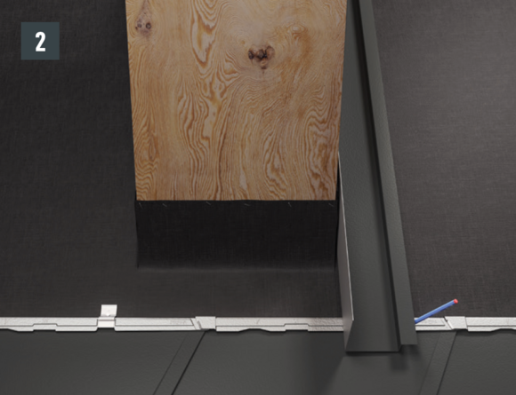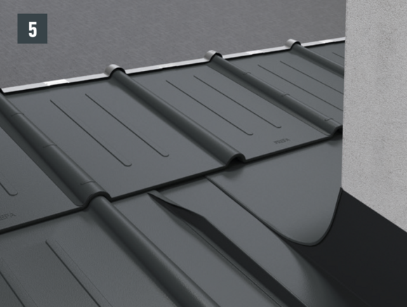 Le converse a camino sono realizzate in modo professionale e in conformità con la pratica della lattoneria. Preparare i raccordi ad aggraffatura verticale piegando verso l'alto la copertura PREFA (30 mm) per adattarla alla scossalina laterale.
