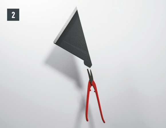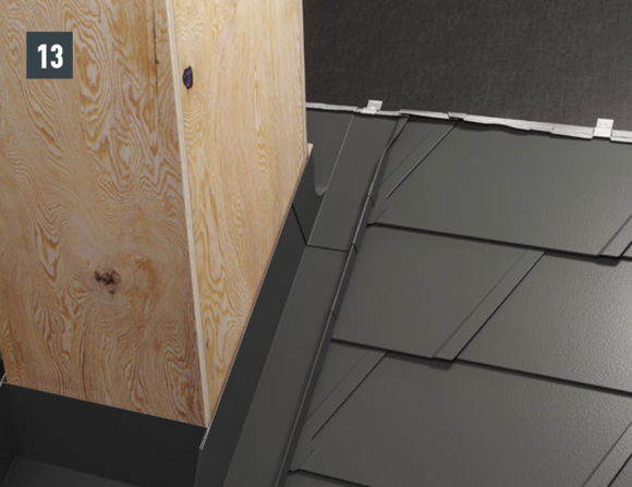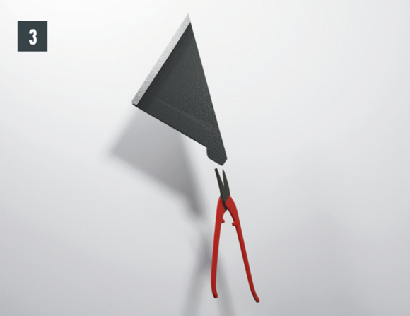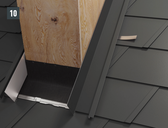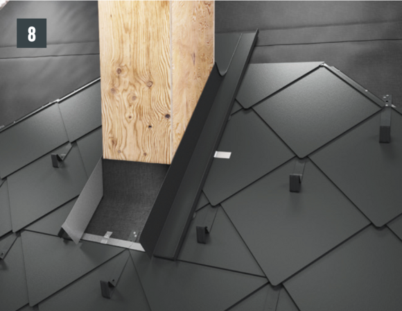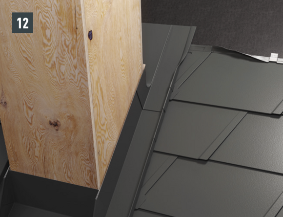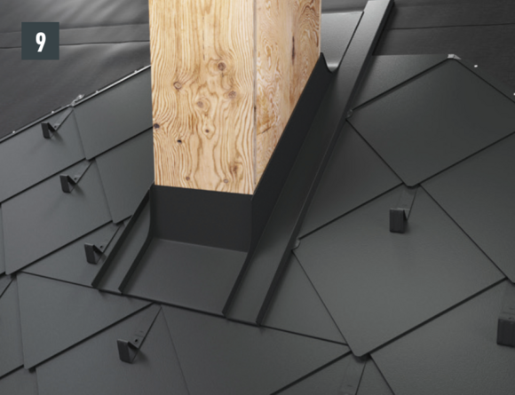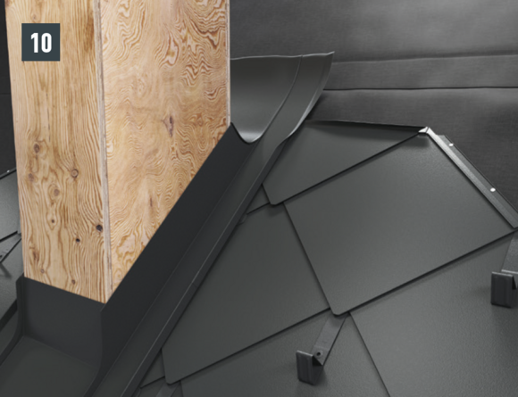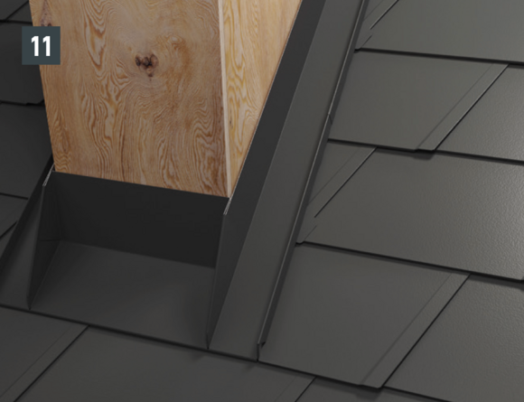 Ripiegare le aggraffature verticali degli elementi laterali nella zona superiore (fig. 10) e rifilare l'elemento posteriore e gli elementi laterali con un margine di 30 mm (fig. 11). Realizzare la bordatura: sopra la conversa si possono ora montare le scaglie di partenza per scaglie 29 × 29 o 44 × 44 e continuare la copertura della superficie del tetto.
