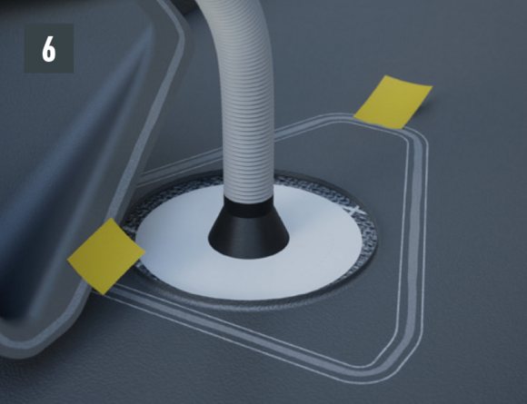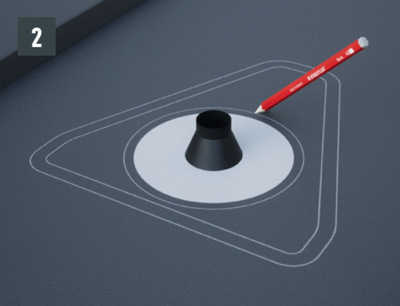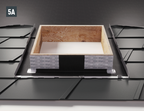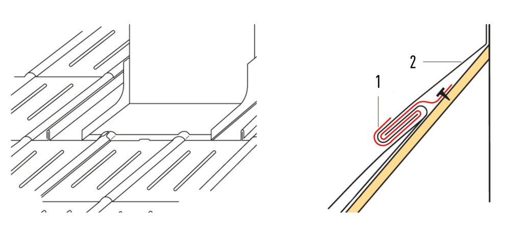 Il tavolato e lo strato separatore devono essere tagliati in base alla sezione di ventilazione (~10 cm di diametro). La copertura del tetto deve essere dotata di un rialzo di 1 cm di altezza intorno all'area del bordo dei ritagli.