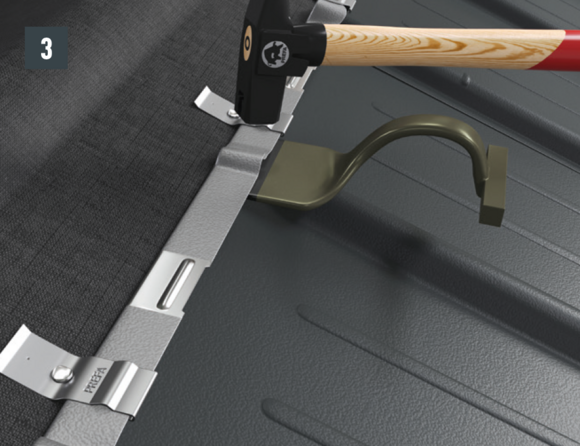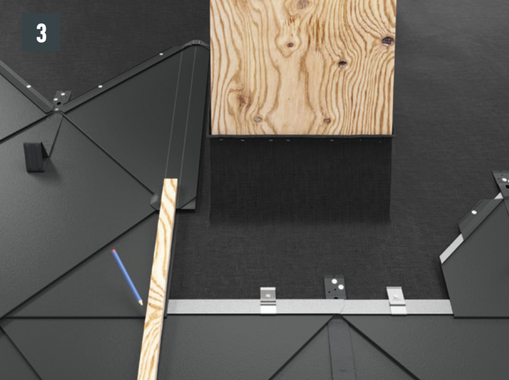 Dopo aver montato le tegole, fino alla posizione desiderata del passo uomo, allineare la bordatura superiore della tegola in modo che sia possibile agganciare la parte anteriore del passo uomo.