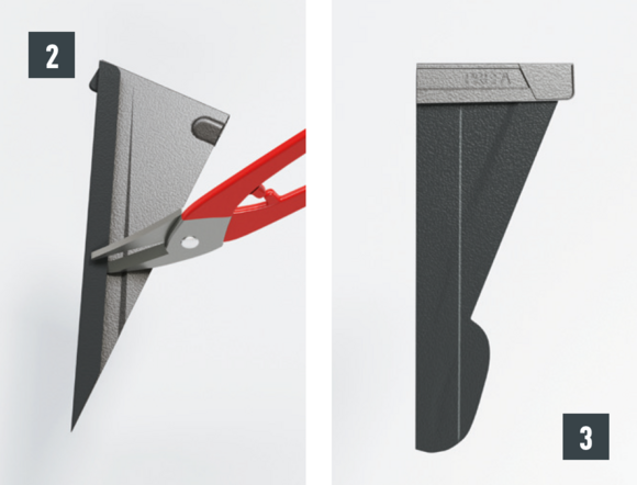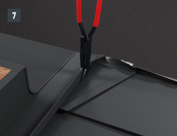 Per l'elemento posteriore della conversa, l'aggraffatura superiore di aggancio della tegola R.16 o del pannello FX.12 da coprire viene tagliata a ca. 200 mm e intaccata. L'aggraffatura di aggancio viene ripiegata all'indietro e la sporgenza laterale viene piegata verso l'alto di 90° (fig. 5 + 6). La parte superiore della conversa viene inserita.