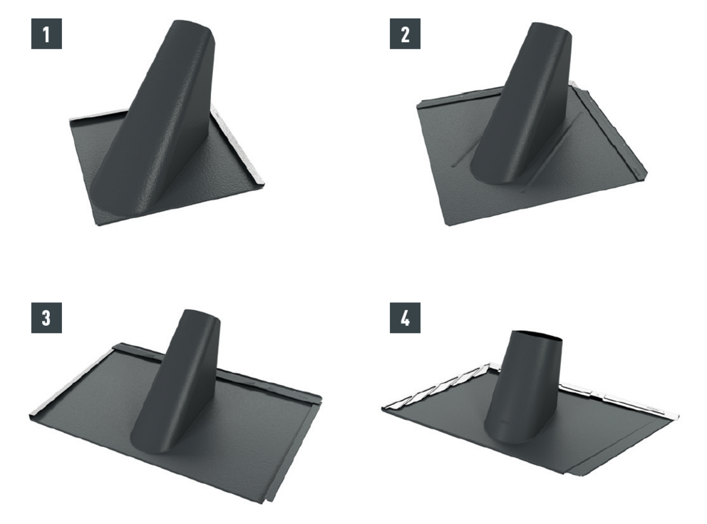 Se la posizione della penetrazione è prestabilita e per questo motivo non è possibile usare la conversa, si possono realizzare tubi passanti per mezzo di una conversa da aggraffare. Le converse sono adatte per tubi passanti di Ø 80-125 mm.