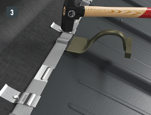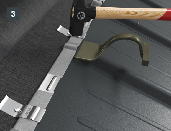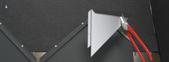 Nella zona del bordo ripiegato, sganciare l’aggraffatura superiore, in modo che resti un'aggraffatura per la staffa, e piegare la tegola R.16 o il pannello per tetto FX.12 di 30 mm ad angolo retto rispetto alla superficie del tetto (fig. 3 + 4).
