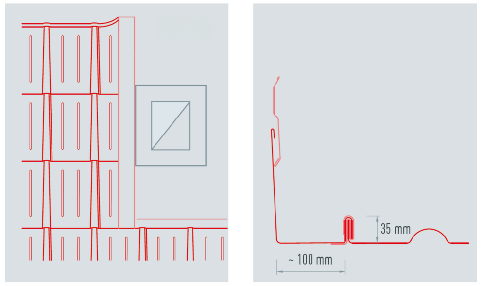 La lunghezza dell'elemento laterale dipende dall'insieme degli elementi del tetto e dal margine di piegatura. Agganciare l'elemento laterale alla copertura PREFA all'estremità inferiore. Nella zona superiore, l'elemento laterale dovrebbe sporgere sopra la bordatura superiore del pannello.