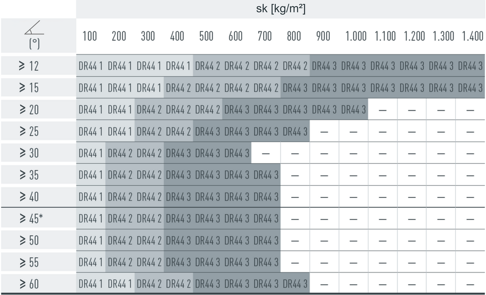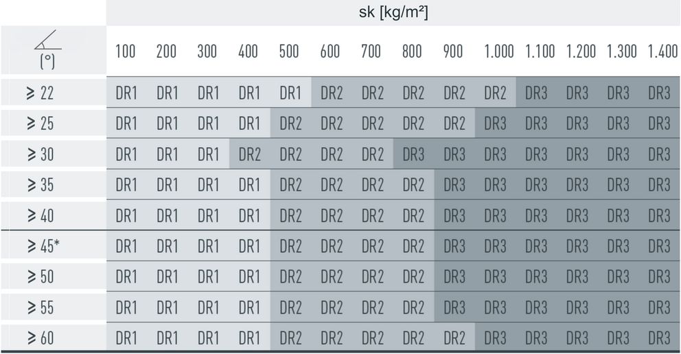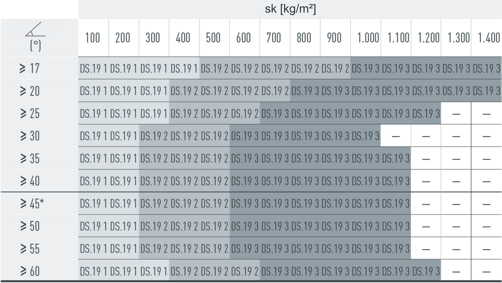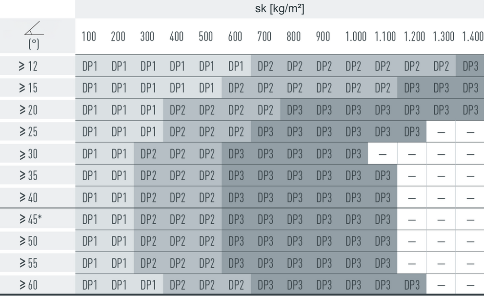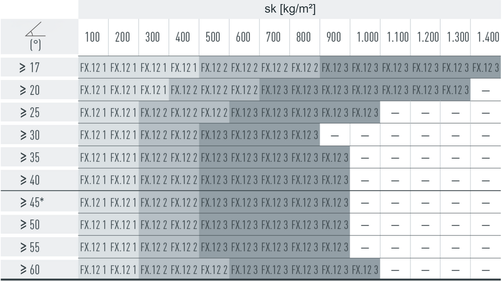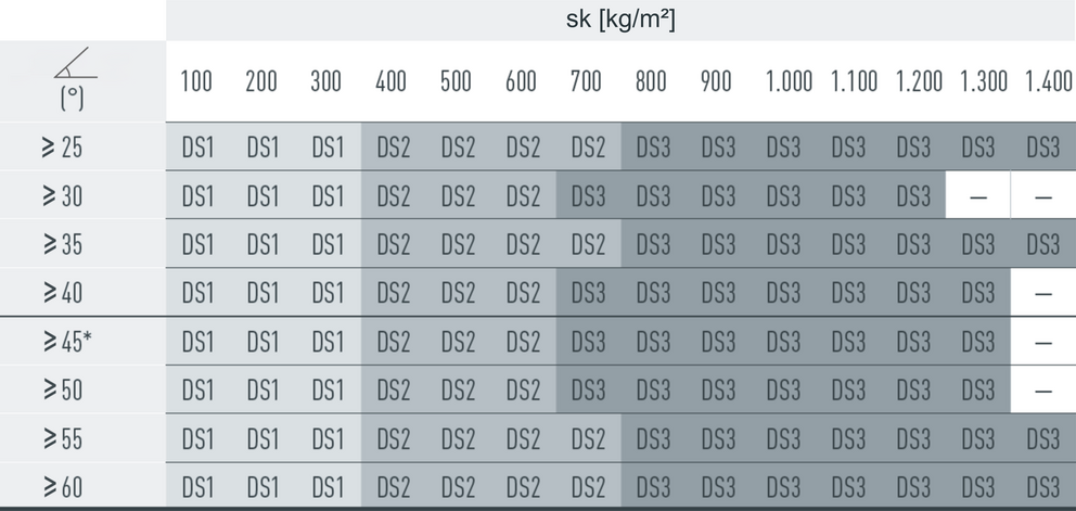 Il montaggio dei nasi fermaneve avviene secondo i seguenti schemi di posa a seconda della pendenza del tetto e del carico di neve. Gli schemi di posa da utilizzare sono riportati nelle tabelle seguenti. In direzione verticale si vede la specifica della pendenza del tetto e in direzione orizzontale la specifica del carico di neve al suolo (sk), I carichi di neve (sk) da considerare per il rispettivo progetto edilizio sono riportati nelle norme e nei regolamenti nazionali.
