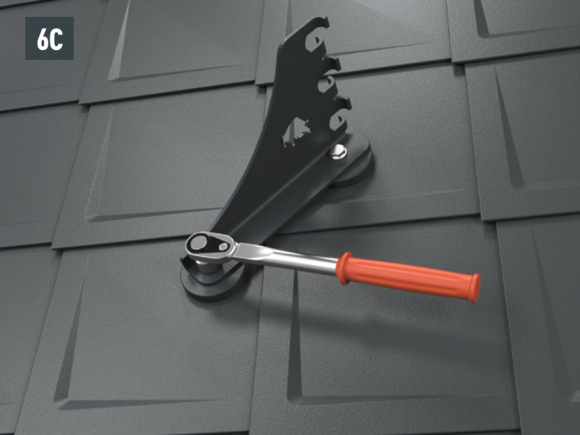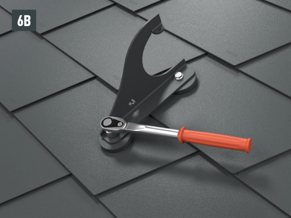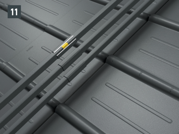 Il montaggio della staffa per tubi fermaneve viene fatto tramite due piedini fissati nel puntone sul manto di copertura. I tubolari a sezione esagonale vengono inseriti nella staffa per tubi fermaneve XL e fissati per mezzo di elementi scorrevoli di fissaggio. I tubolari a sezione esagonale vengono poi collegati per mezzo di manicotti di giunzione, altezza totale: 360 mm.