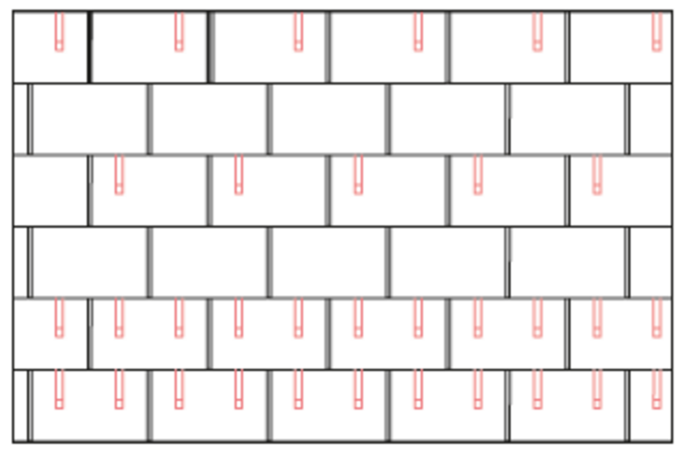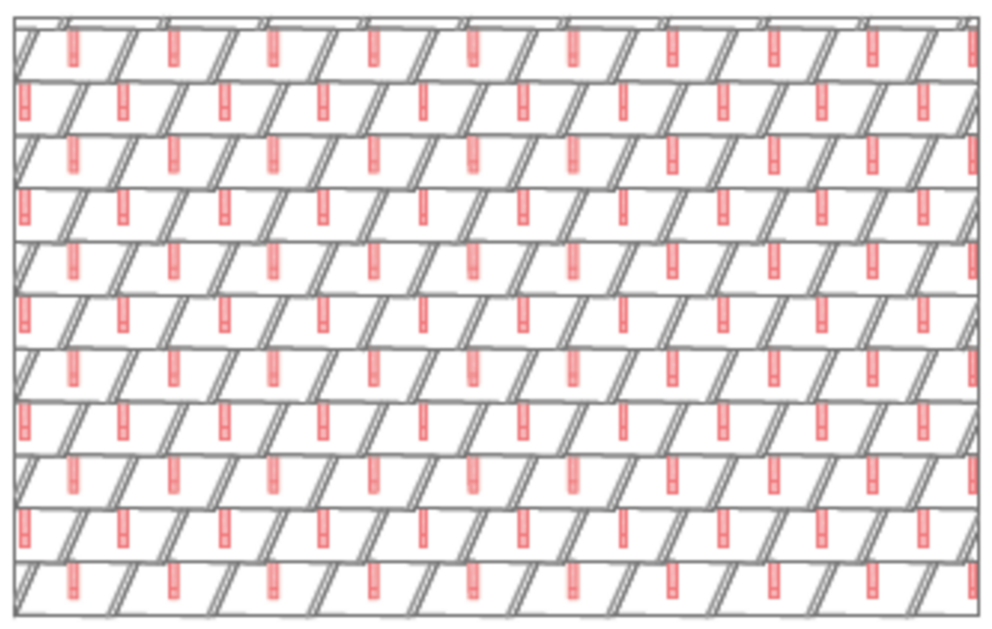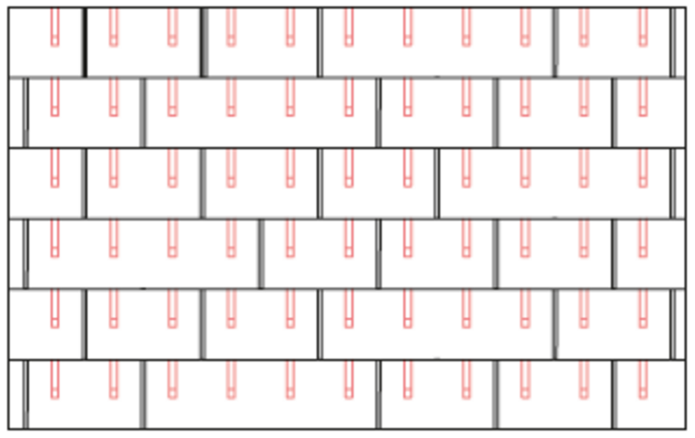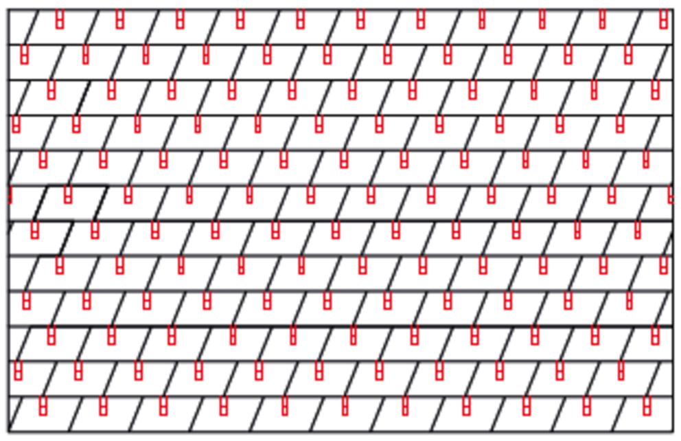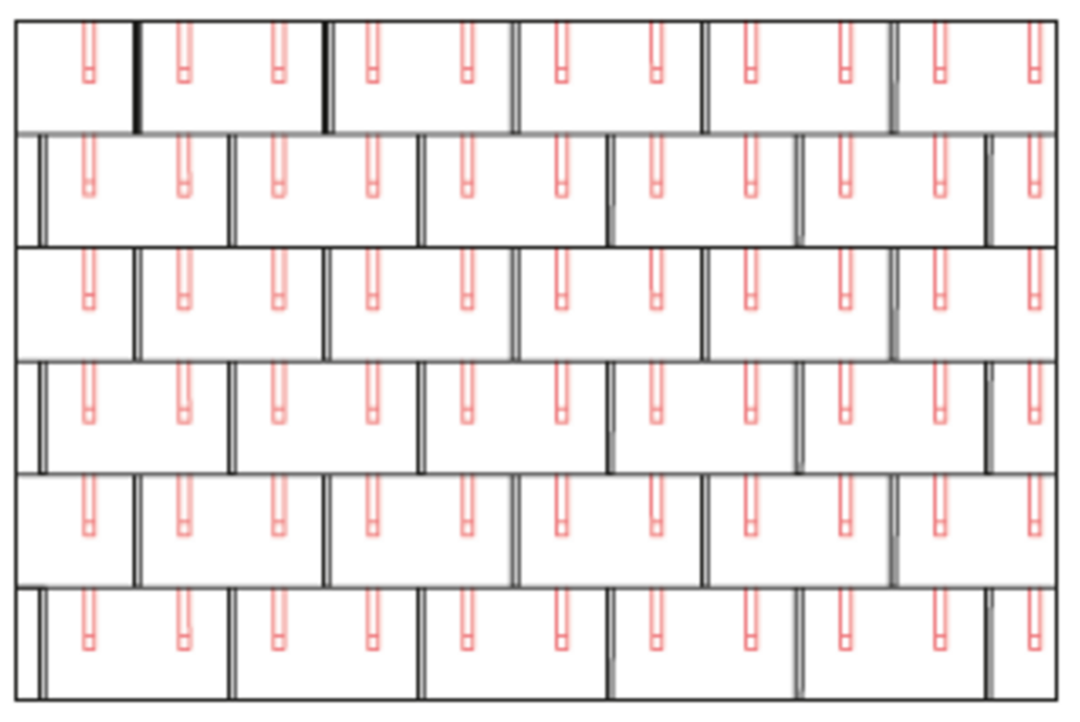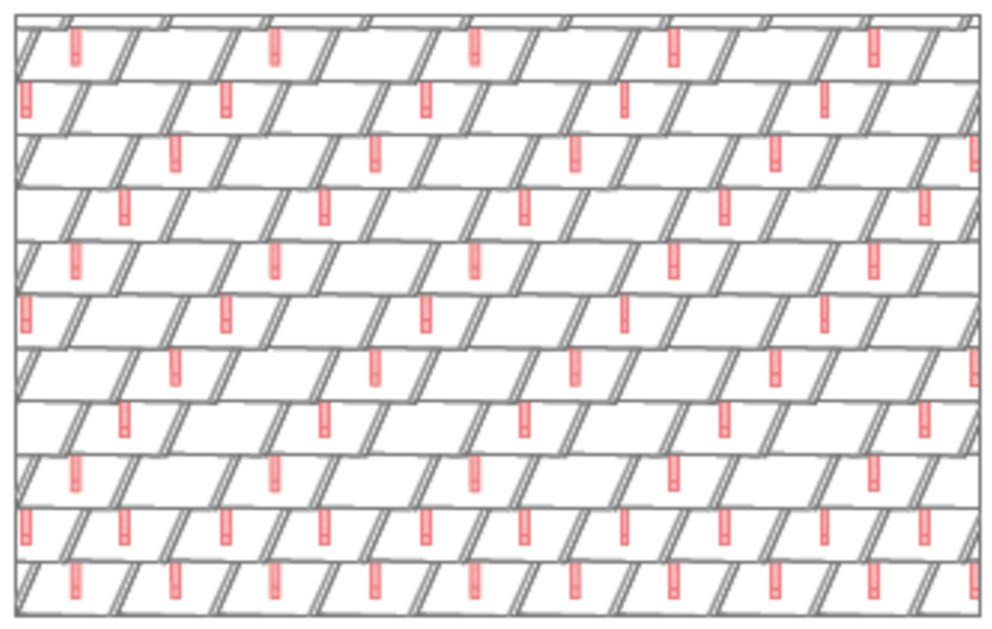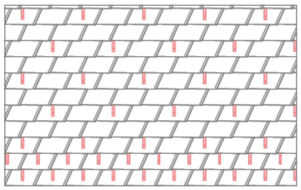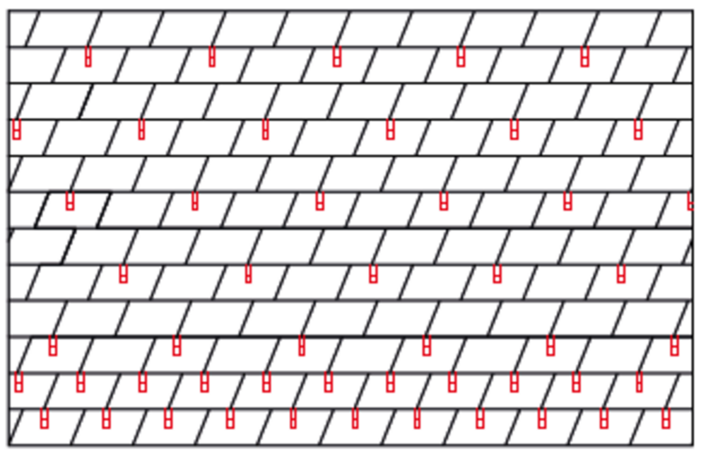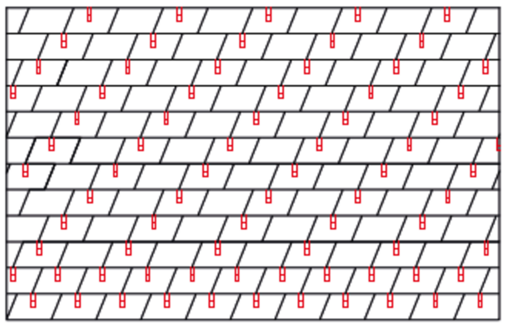 Principalmente, i pannelli FX.12 vengono posati in modo irregolare con uno sfalsamento dell'aggraffatura angolare verticale di min. 220 mm. A causa dello sfalsamento casuale dei pannelli FX.12, uno schema di posa simmetrico non è possibile. Se è previsto l'uso di nasi fermaneve per FX.12, si raccomanda che la posa dei pannelli FX.12 sia effettuata con uno sfalsamento regolare. Questo riduce il disegno irregolare che di solito si ottiene con i pannelli FX.12, ma è l'unico modo per avere uno schema di posa regolare con nasi fermaneve (fig. 1 + 2).