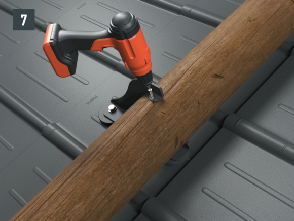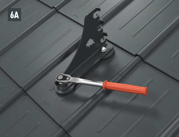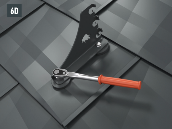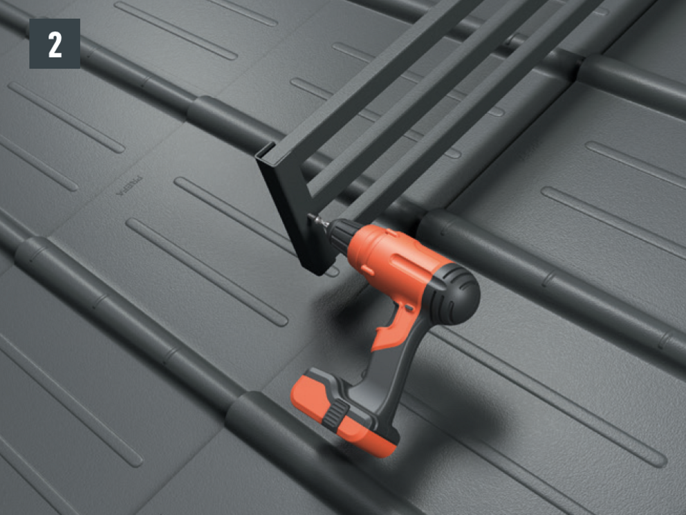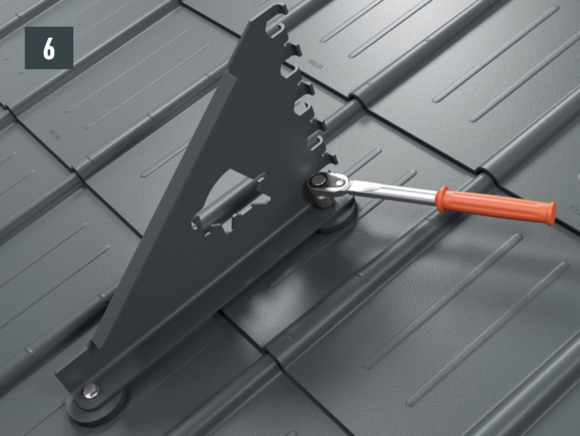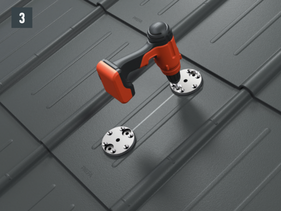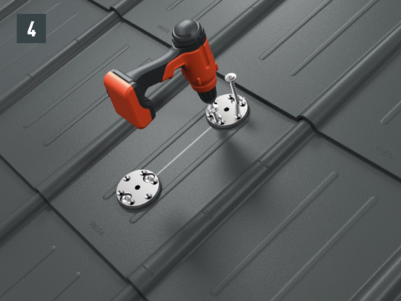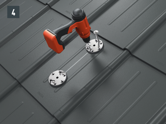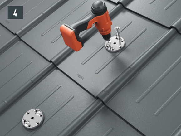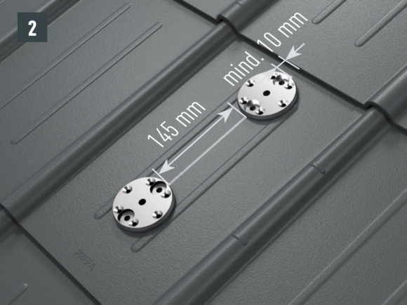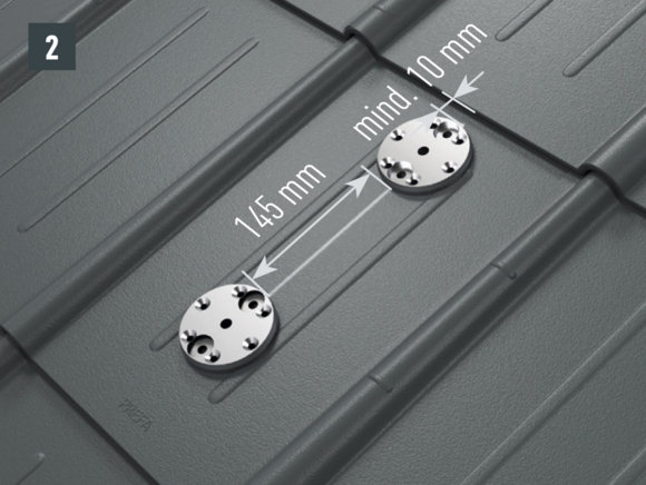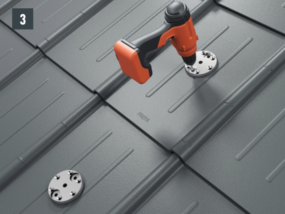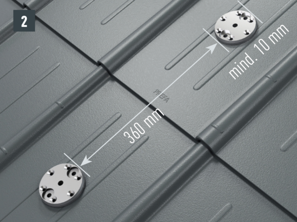 Non fissare il piedino sull'aggraffatura o sull'onda di un elemento di copertura PREFA. Rispettare le zone di posa sui vari prodotti per copertura. Può essere necessario montare una sottopiastra (ad es. se un'aggraffatura o un'onda si trovano nella zona del puntone).