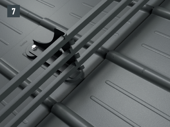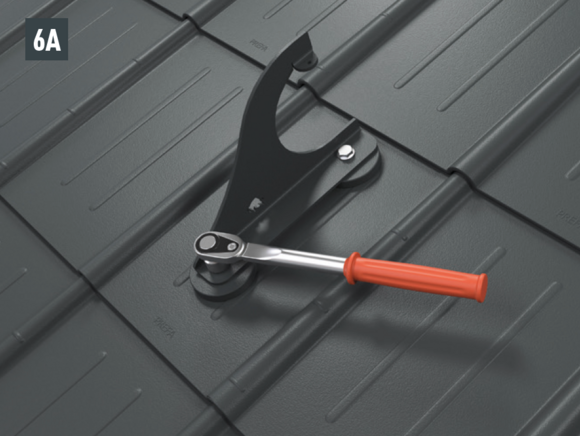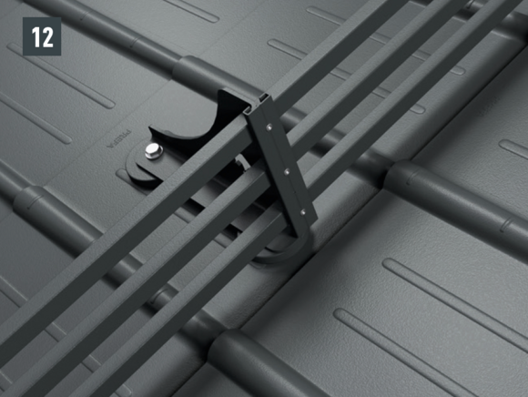 Il montaggio della staffa per tubi fermaneve viene fatto tramite due piedini fissati sul manto di copertura. I tubolari a sezione esagonale vengono inseriti nella staffa per tubi fermaneve e fissati per mezzo di elementi scorrevoli di fissaggio. I tubolari a sezione esagonale vengono poi collegati per mezzo di manicotti di giunzione, altezza totale con piedini: 219 mm.
