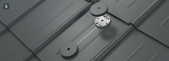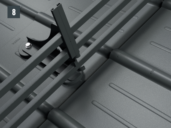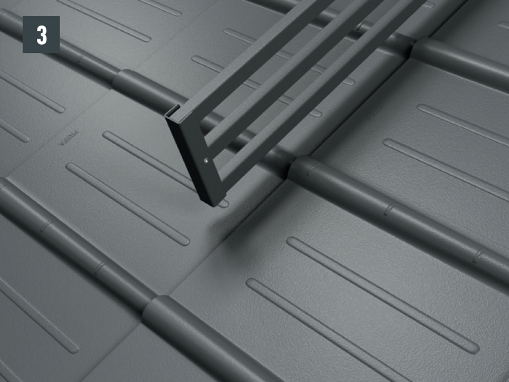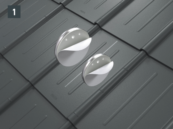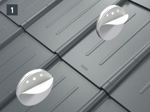 Non appoggiare e fissare i piedini sull'aggraffatura o sull'onda degli elementi di copertura PREFA. Rispettare le zone di posa sui vari prodotti per copertura. Può essere necessario montare una sottopiastra (ad es. se un'aggraffatura o un'onda si trovano nella zona del puntone).