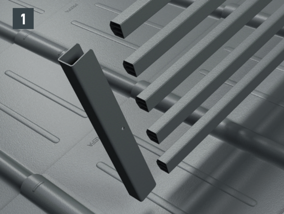 A seconda delle condizioni dell’edificio e del luogo, potrebbe essere necessario installare diverse file di tubi fermaneve. Le distanze massime ammissibili devono essere calcolate in base al carico di neve, alla pendenza del tetto e alla distanza tra le travi.