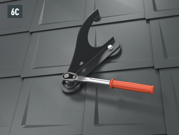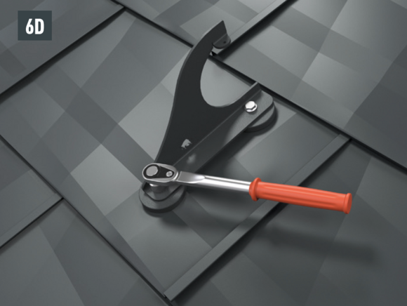 Montaggio della staffa fermaneve per legno tondo con le due viti a testa esagonale (M12) ai piedini (SW19, coppia: 35 Nm) su tegole (fig. 6A), scandole (fig. 6B), scaglie (fig. 6C), R.16 e FX.12 (fig. 6D).