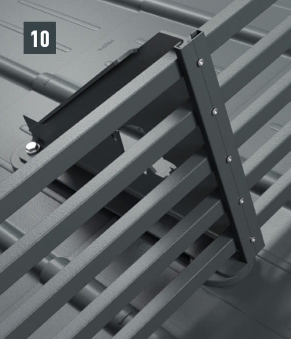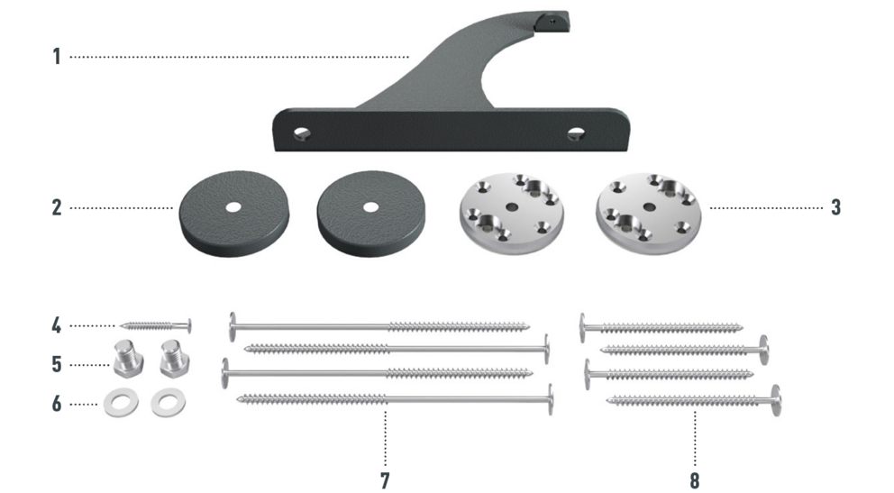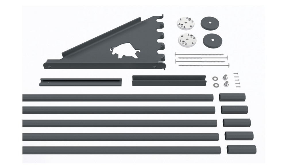 Realizzato in lega di alluminio ad alta resistenza, preverniciato, composto da due piedini con guarnizioni da superficie, staffa per tubi fermaneve XL ed elemento scorrevole di fissaggio, materiale di fissaggio incluso |