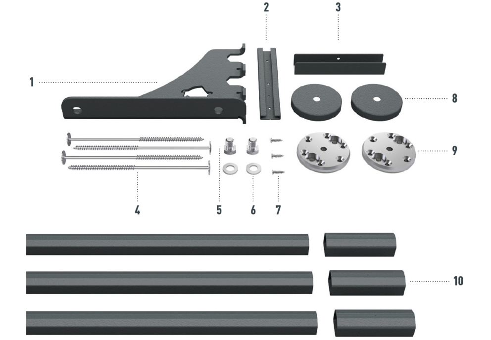 Realizzato in lega di alluminio ad alta resistenza, preverniciato, composto da due piedini con guarnizioni da superficie, staffa per tubi fermaneve ed elemento scorrevole di fissaggio, materiale di fissaggio incluso |