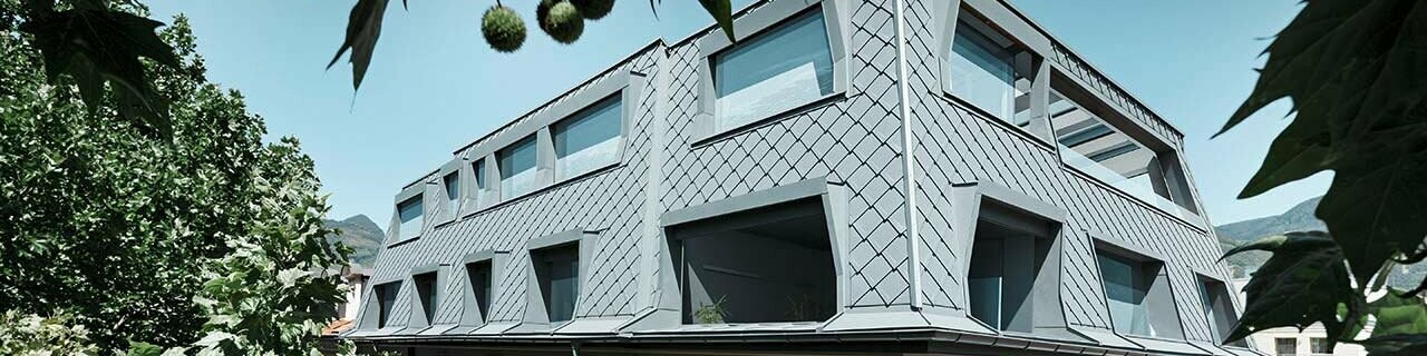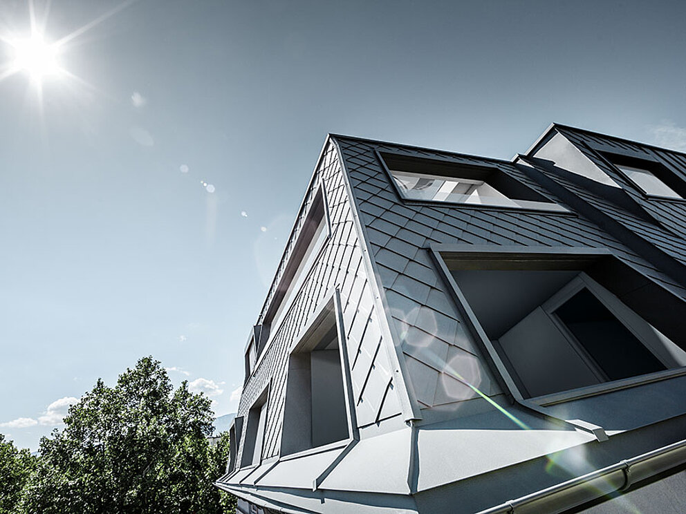 Trattandosi di una sopraelevazione era determinante selezionare un materiale leggero, che non appesantisse in maniera significativa le strutture, preservando la sicurezza statica dell’edificio. La leggerezza delle Scaglie PREFA, unita alle dimensioni contenute dei singoli elementi, ha facilitato le operazioni di posa, assicurando estrema maneggevolezza e ottima lavorabilità. Inoltre, grazie alla flessibilità del materiale e alla possibilità di perfetta integrazione con elementi di complemento (cornici, compluvi, raccordi) nello stesso materiale, è stato possibile conseguire eccellenti risultati dal punto di vista dell’impermeabilizzazione soprattutto in corrispondenza dei raccordi con le grandi vetrate. La posa in opera del rivestimento su una superficie complessiva di 260 mq è stata eseguita con maestria dai lattonieri della ditta Stuefer di Sarentino, in tempi piuttosto brevi: l’intera realizzazione ha richiesto soltanto 6 mesi di lavoro.