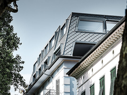 Il nuovo sistema di fissaggio integrato ed a scomparsa, permette di ottimizzare i tempi della posa e inoltre, conferisce al rivestimento stabilità e sicurezza, offrendo la possibilità di utilizzare il sistema sia in copertura che in facciata e creando una superficie uniforme senza necessità di fissaggi esterni. In questo caso, la forte pendenza delle falde mansardate avvicina molto la funzione del tetto a quella delle chiusure verticali.