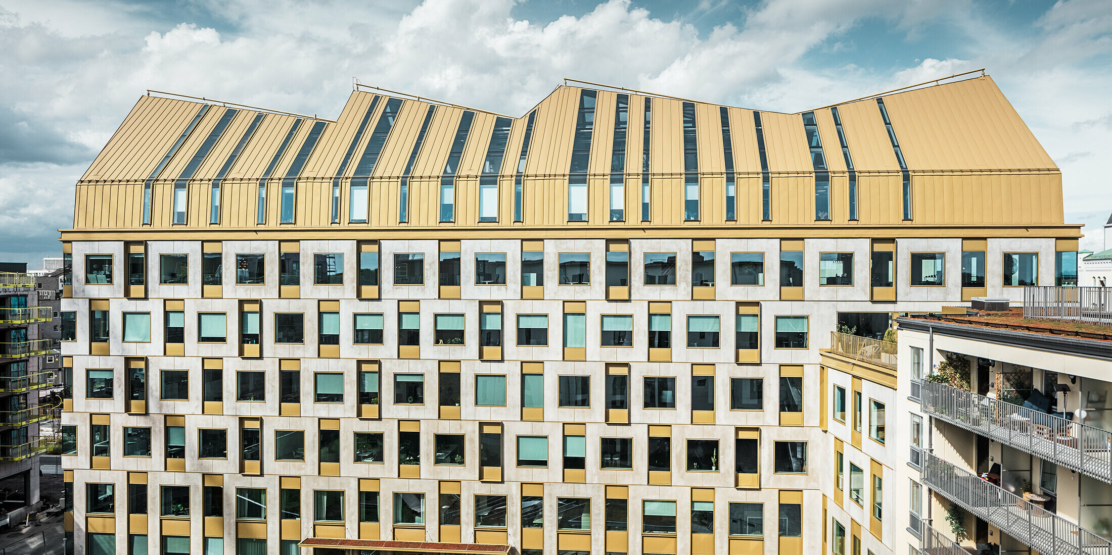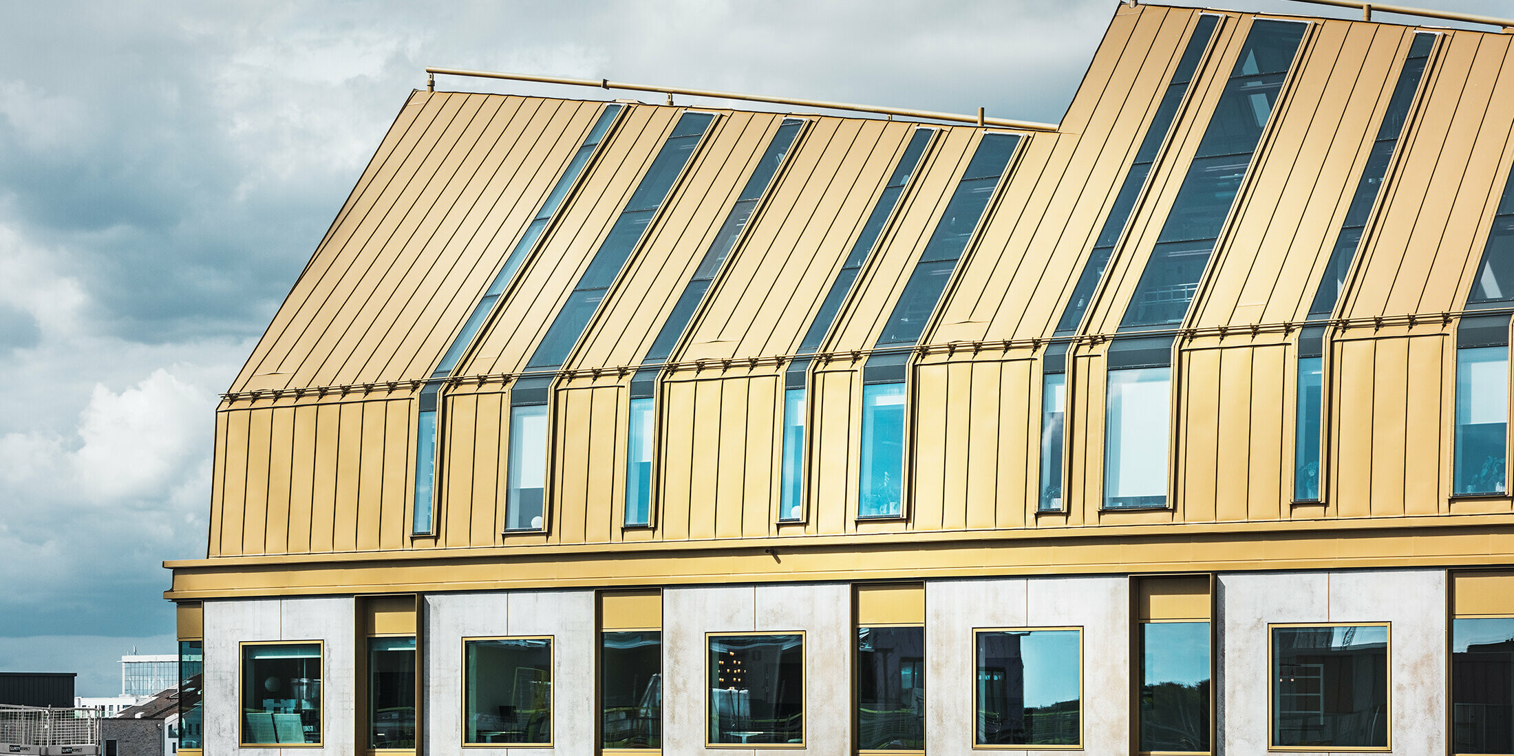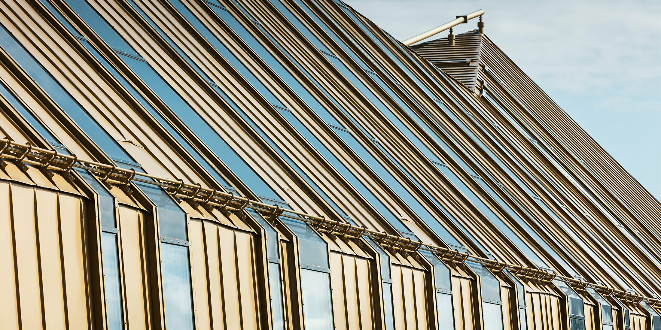 La struttura portante in acciaio del tetto è coperta da 2.000 m² di PREFALZ, il cui rivestimento è una produzione speciale PREFA. Il nuovo colore speciale sviluppato si chiama «oro Jaisalmer-2525», dal nome della città nel deserto indiano di Jaisalmer, la cui fama di città dorata è stata il modello per il colore scintillante del rivestimento.